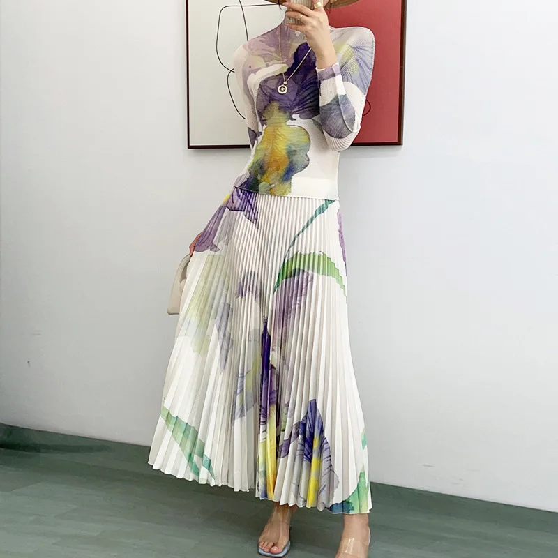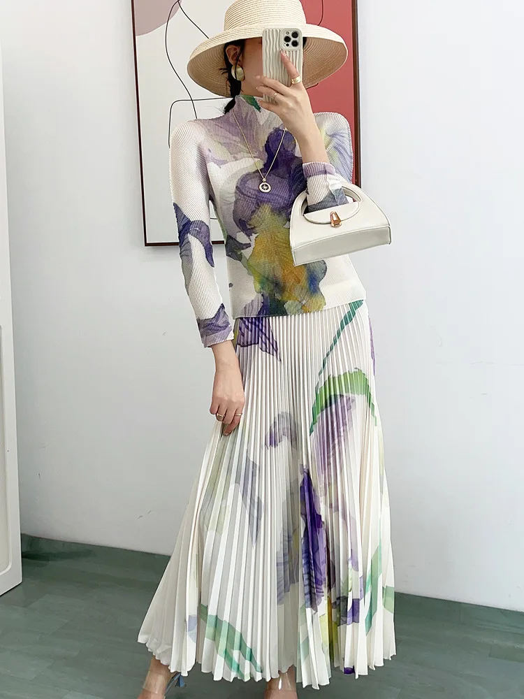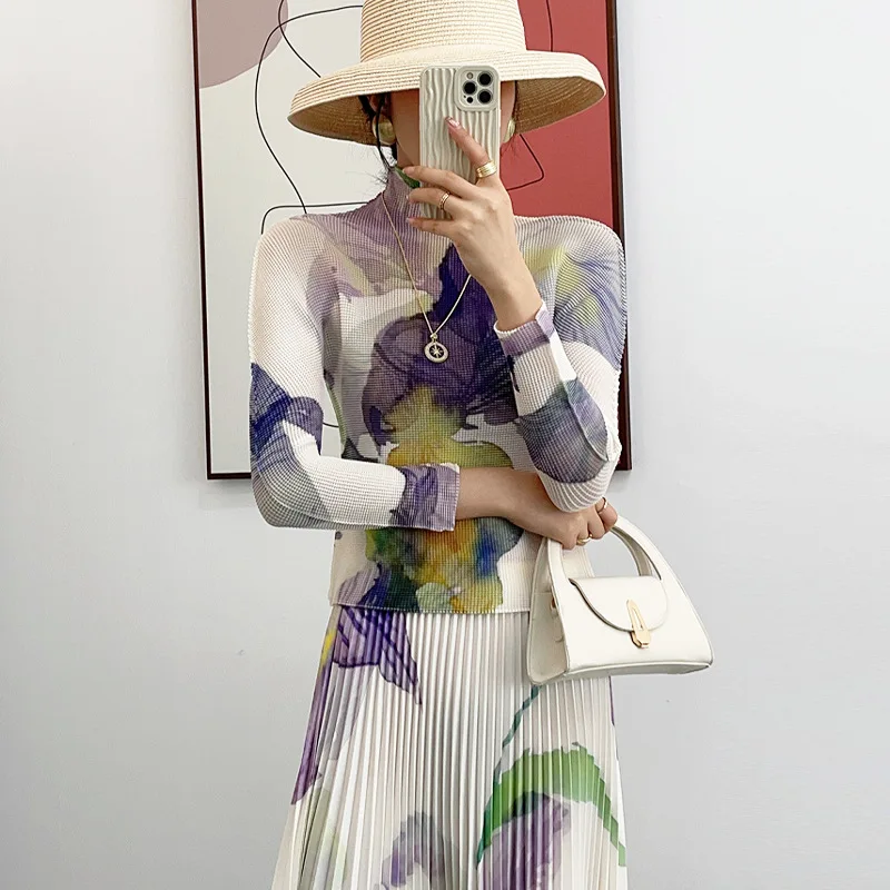Fast Shipping Pleated 2-Piece Set Elastic Turtleneck Top Printed Long Sleeve Shirt and Pleated Skirt Casual Style Two-Piece Set