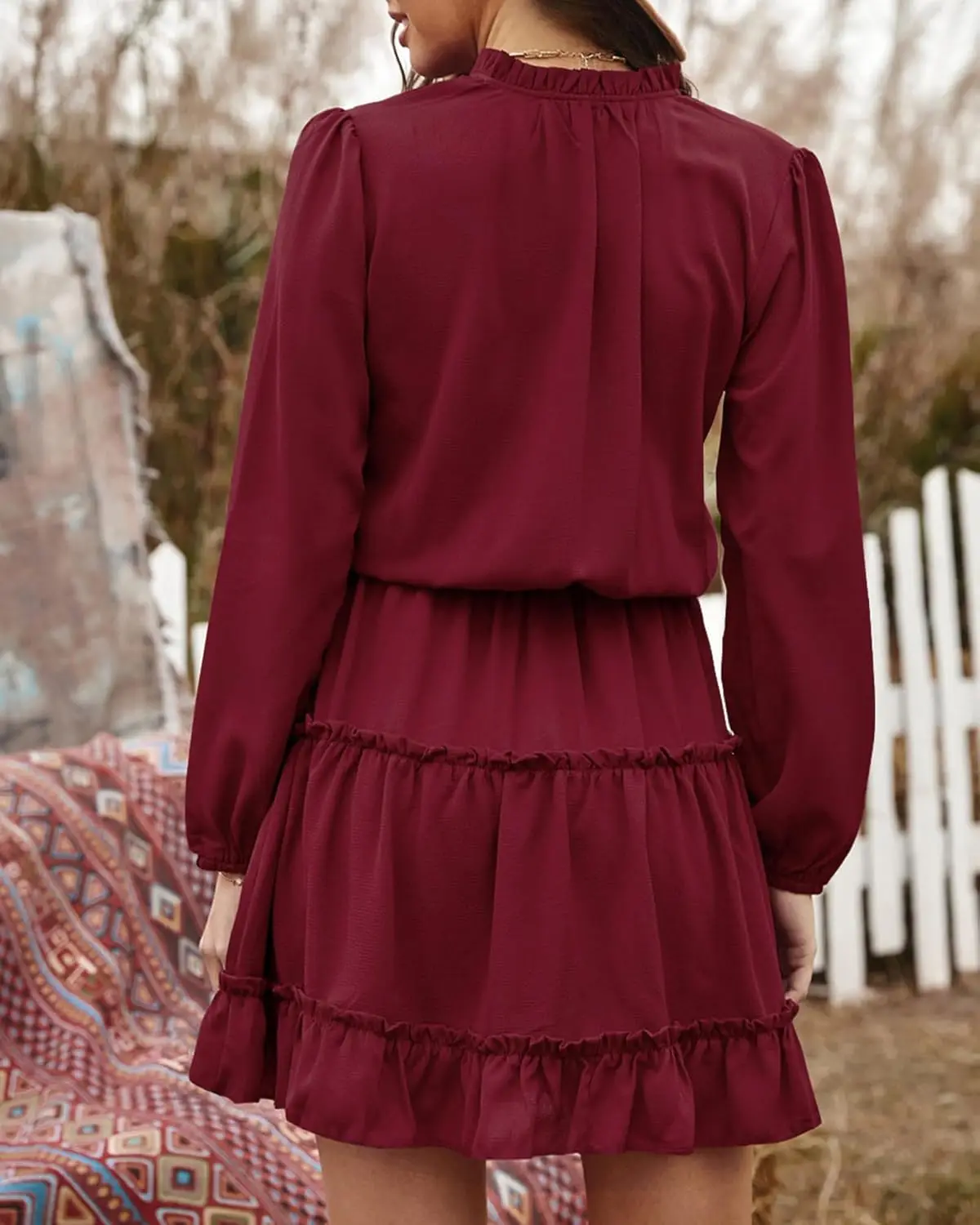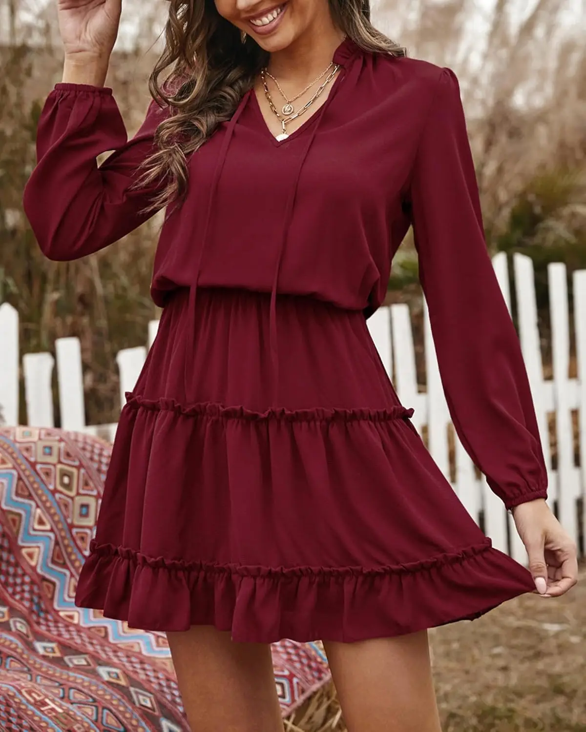 Women's Casual Summer Fall Dress V-neck Long Sleeve Natural High Waist Tiered Ruffle A-line Swing Tunic Chiffon Solid Plain Dyed