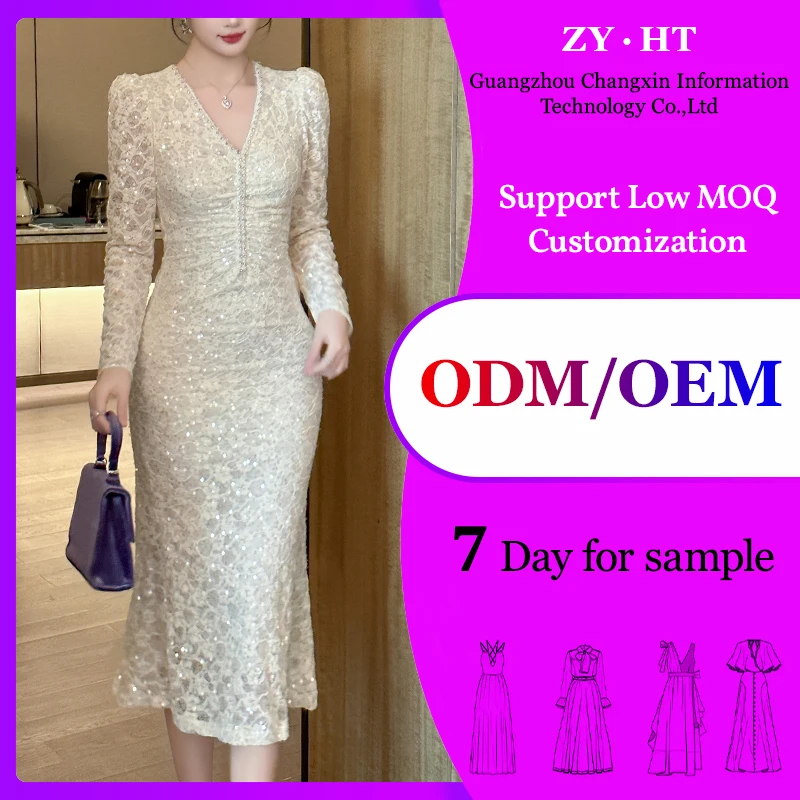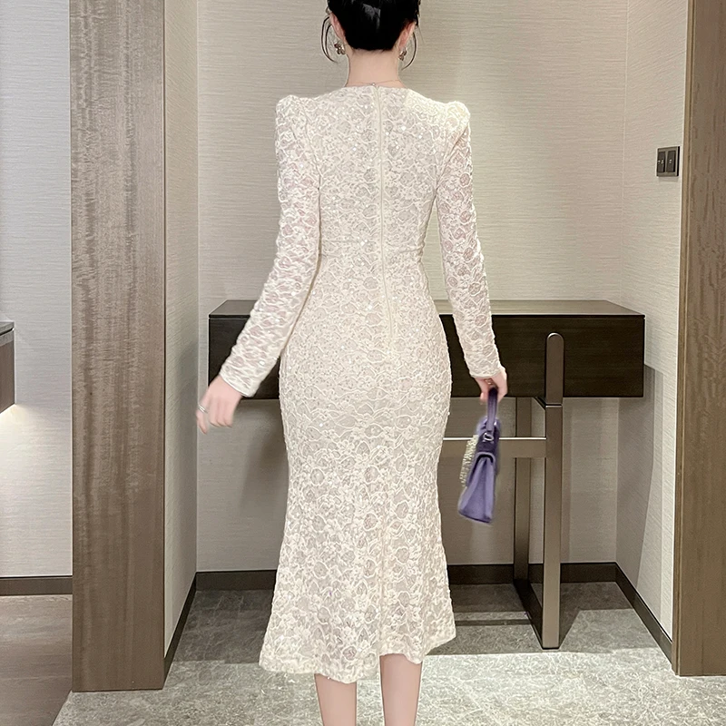 ZYHT 45023 Ladies Elegant Midi Long Dress New White V-neck Sequined Rhinestones Lace Dress for Women Party Dinner Dresses
