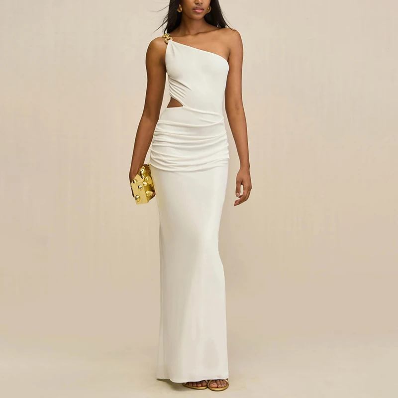 ZYHT 73996 High End Women Clothes Manufacturer Hollow Out White Stretchy One Shoulder Women Lady Evening Party Dress
