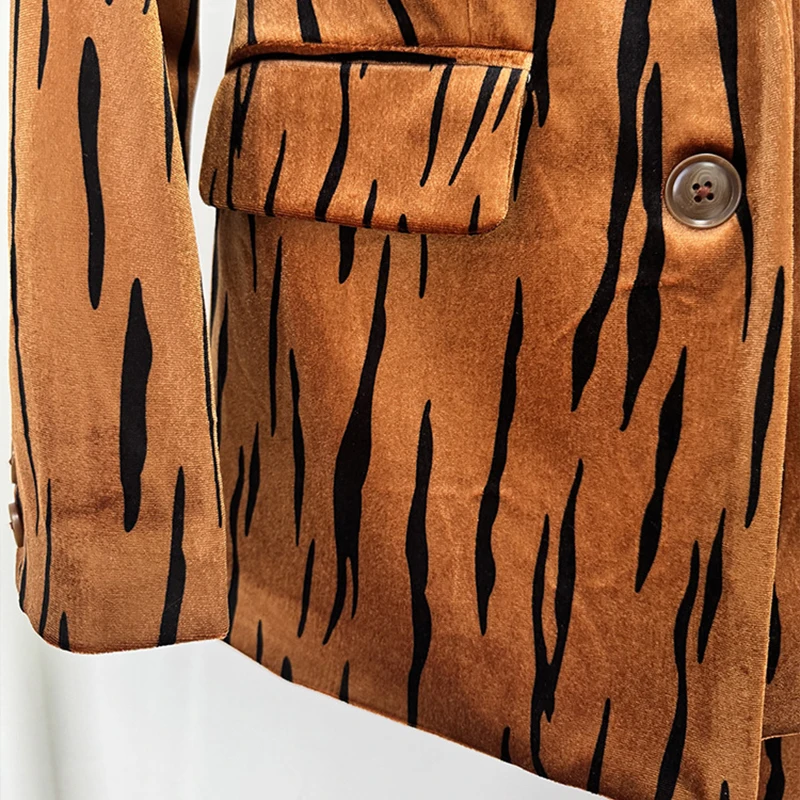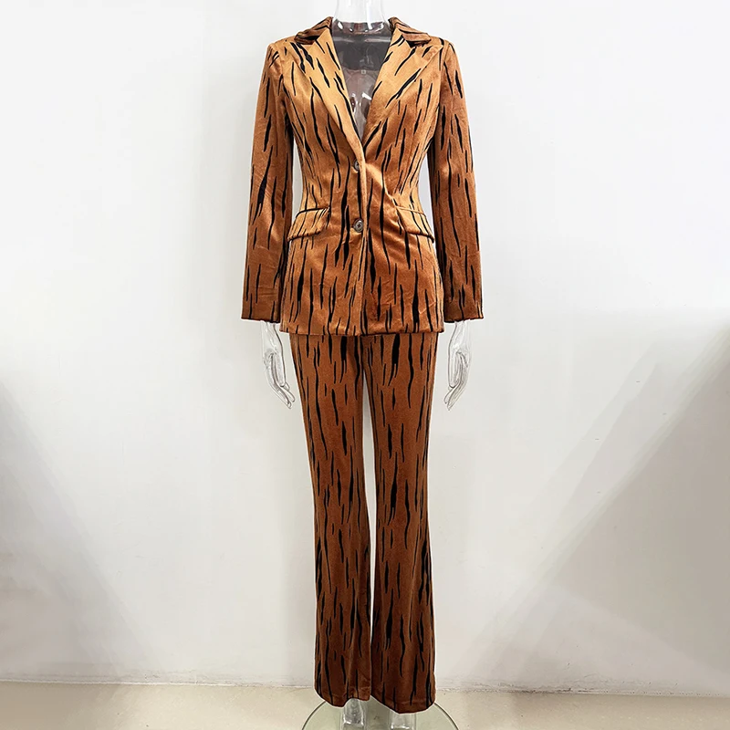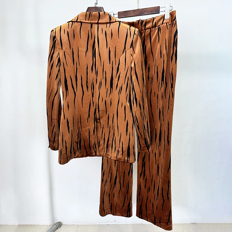 ZYHT 70162 Autumn & Winter New Arrival Fashionable Leopard Print Stripe Printed Velour Longline Blazer Two-Piece Set for Women
