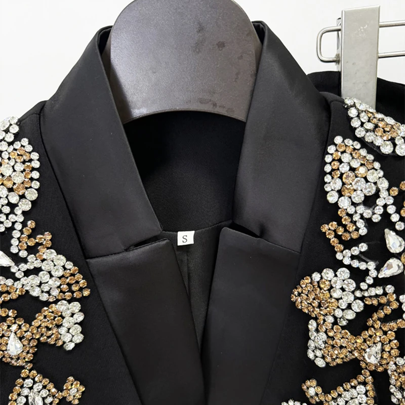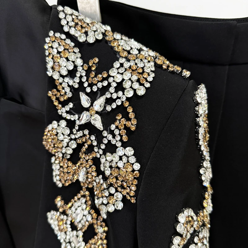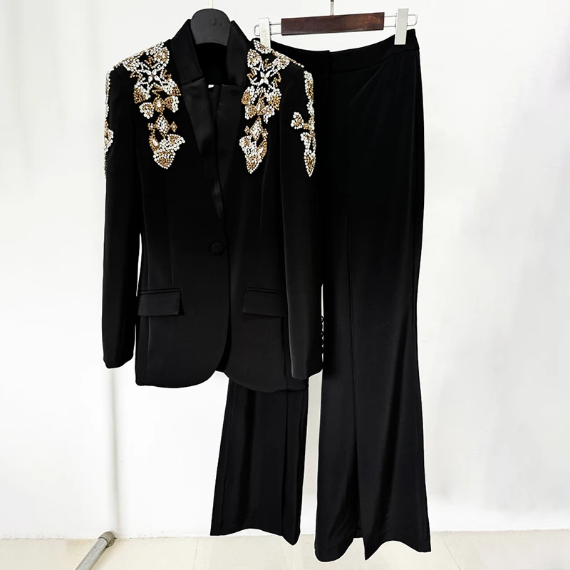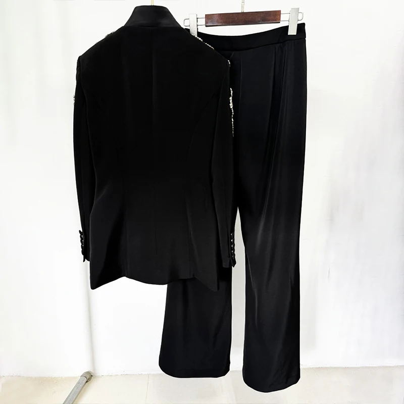 ZYHT 70156 European Style Heavily Embellished Rhinestone Beaded Stand Collar Blazer with Split Trousers Pants Suit Set