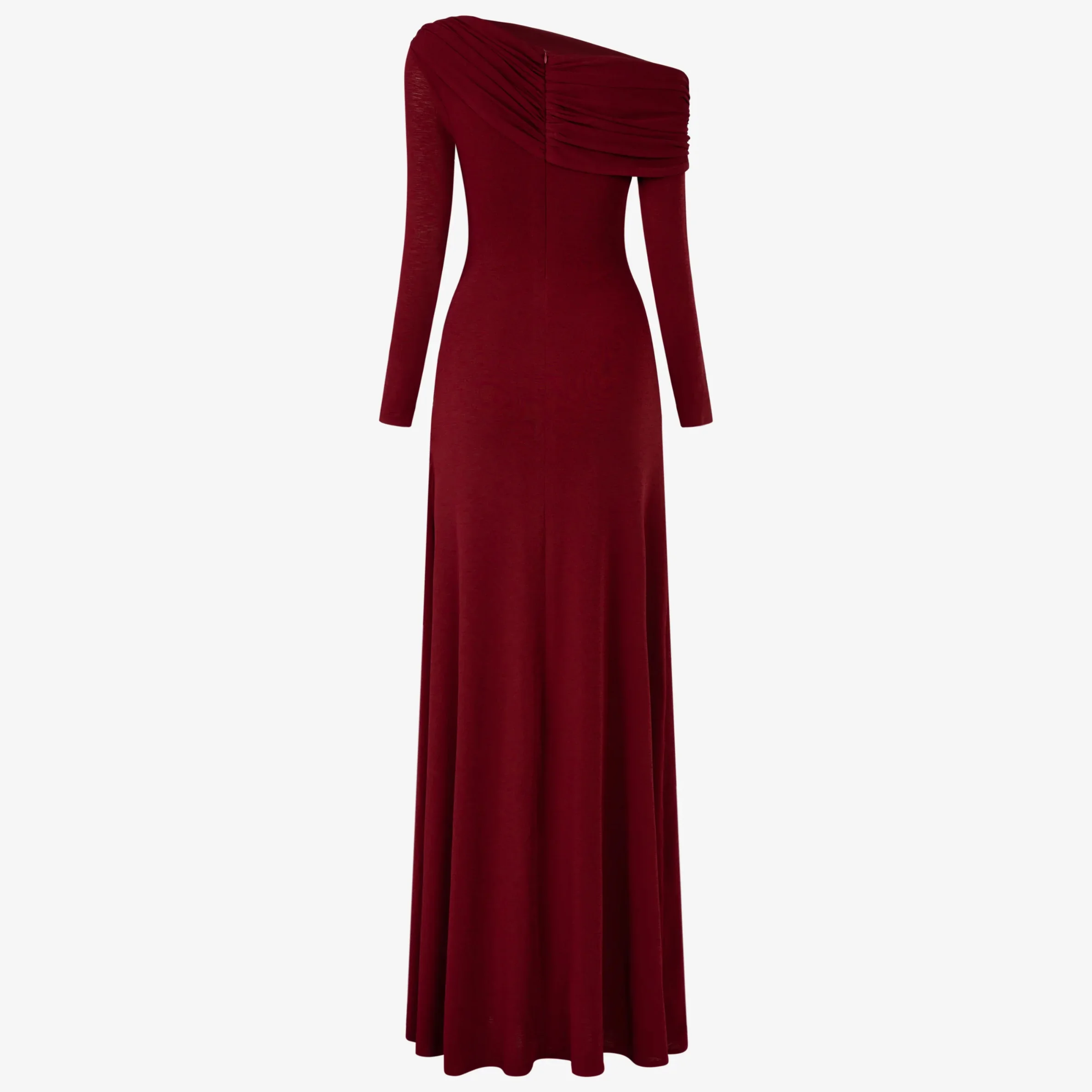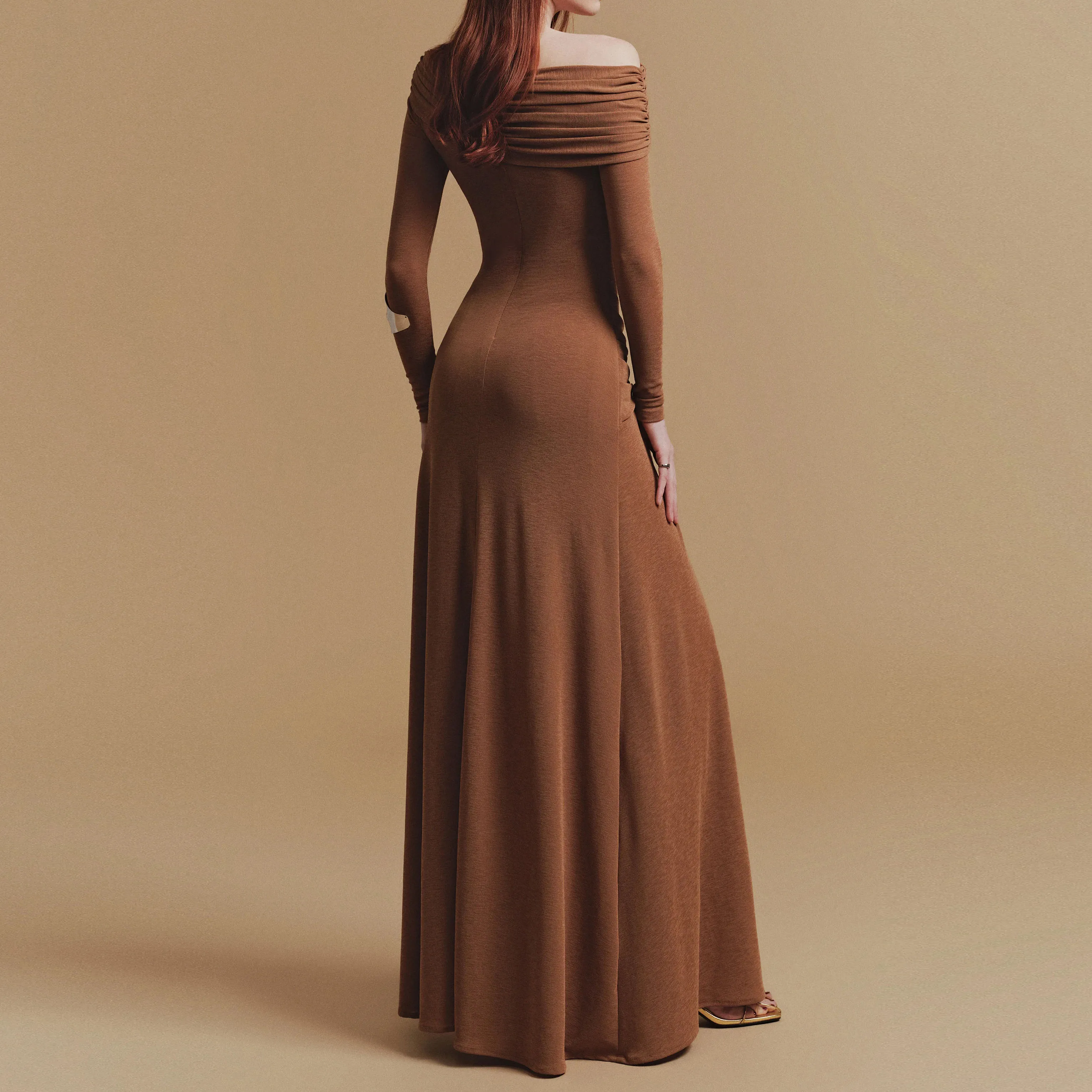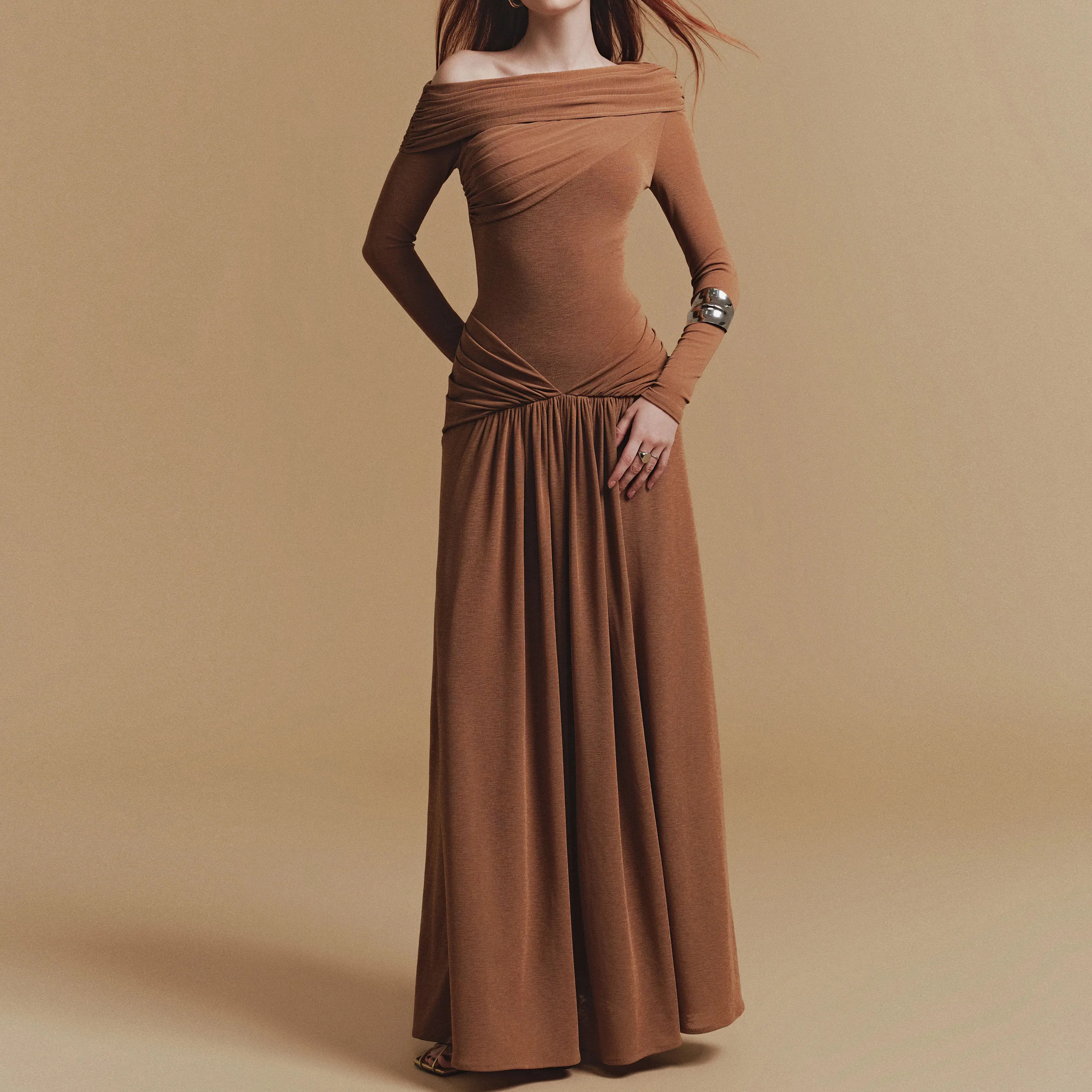 ZYHT 73905 Dusty Rose Off-The-Shoulder Long Sleeve Stretch Jersey Dress Ruched Bodice Floor Length Fish Tail Maxi Dress