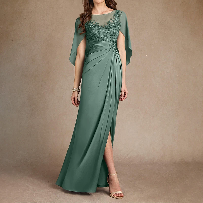 ZYHT 73982 Customization Short Sleeve Split Mother Mom Wedding Satin Lace Elegant Wedding Evening Party Dress