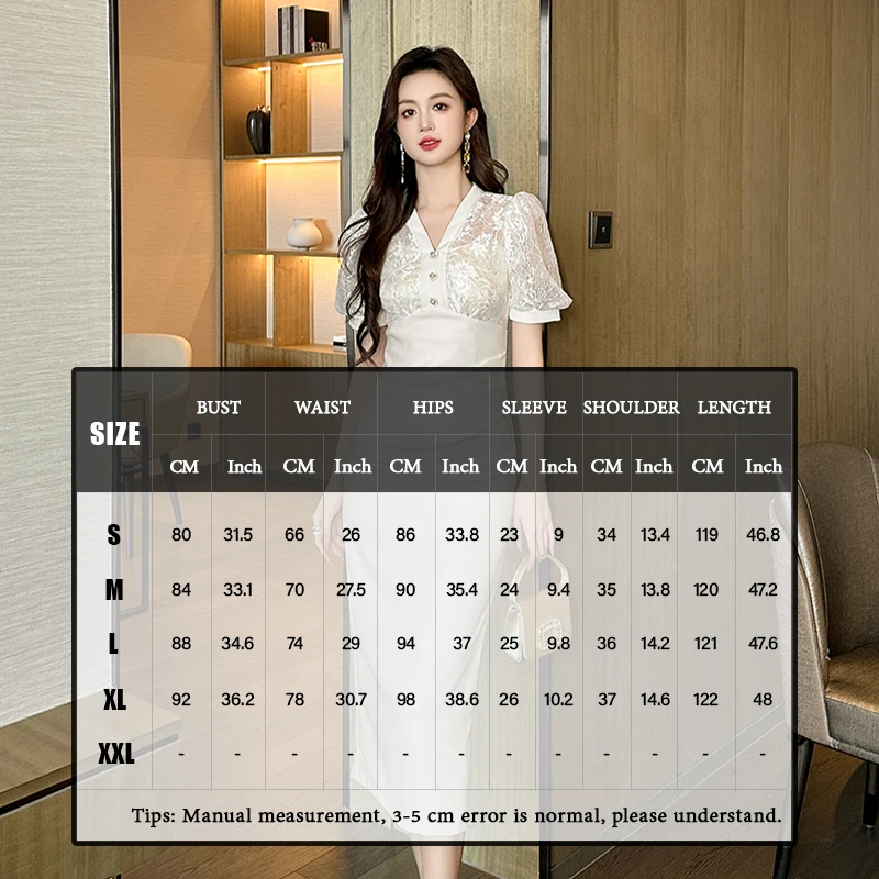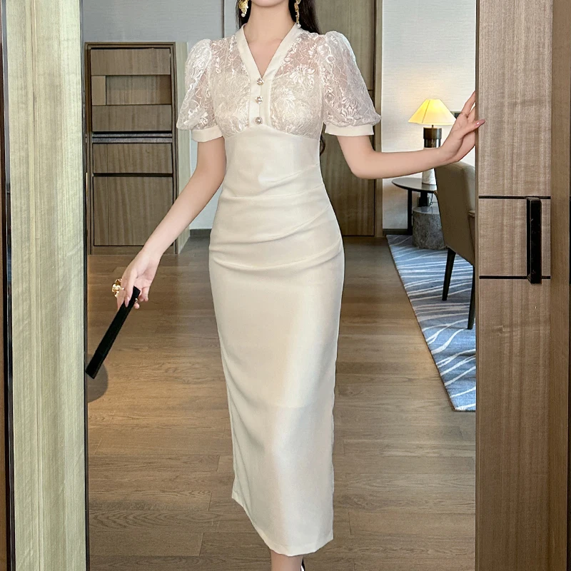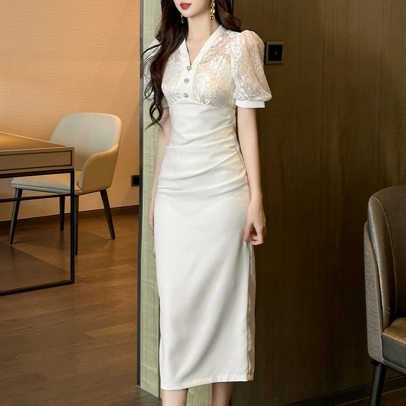 ZYHT 21234 Wholesale V Neck Lace Patchwork High Waist Cute Midi Dress Party Ladies White Dresses for Woman Elegant Dresses