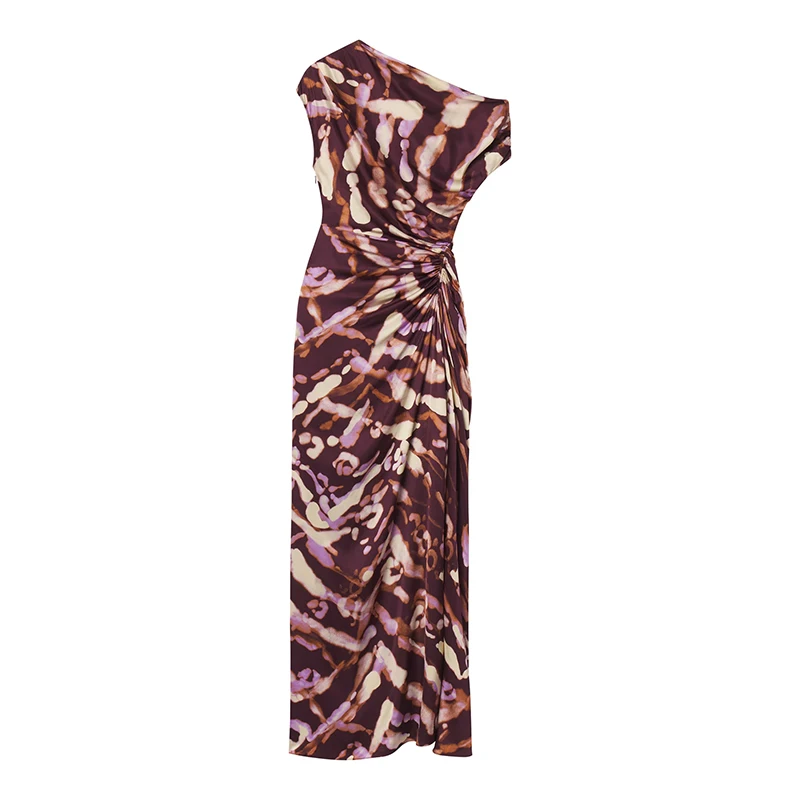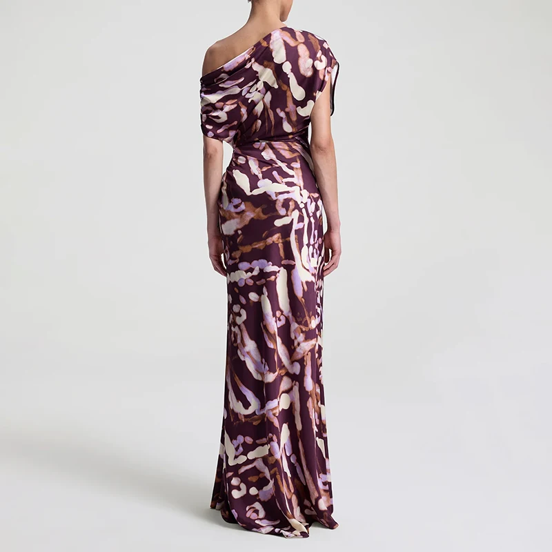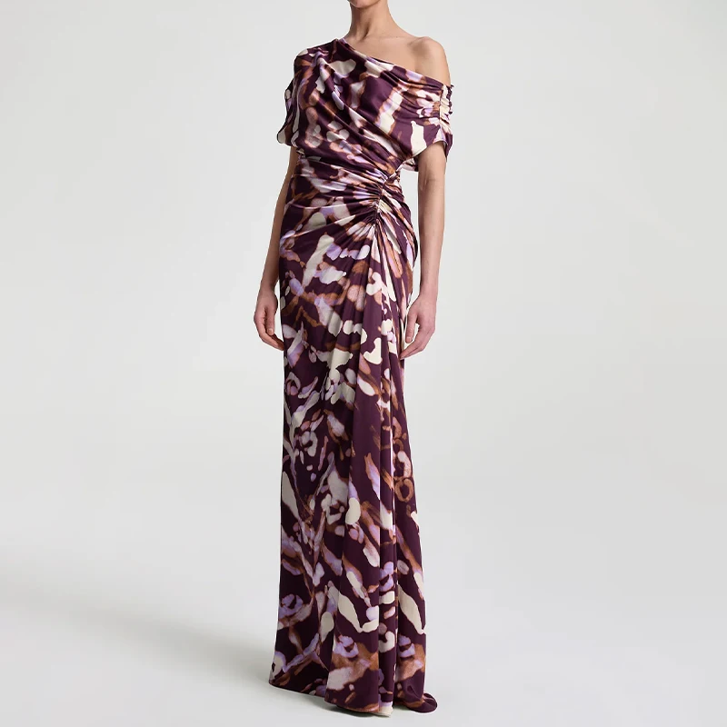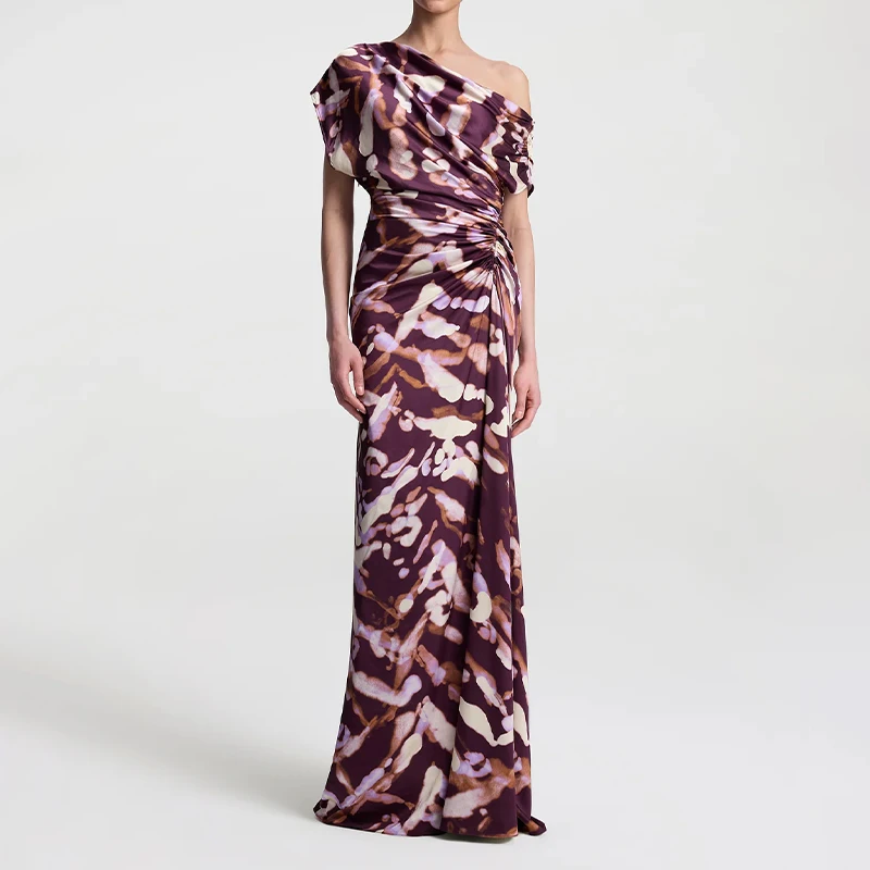ZYHT 73963 Matte Satin Printed Geometric Pattern Maxi Women Asymmetric One Shoulder Ruched Hem Women Dress