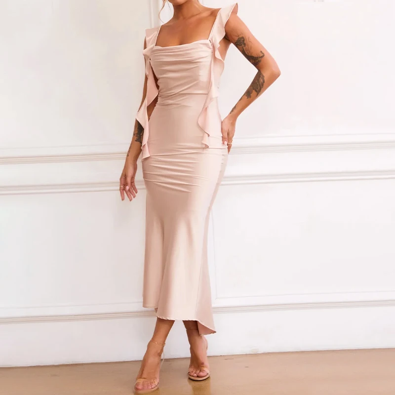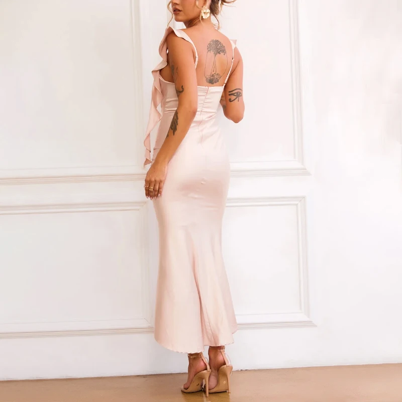 ZYHT 73959 Custom Women Lady Pink Satin Backless Sleeveless Straps Ruched Bust Midi Evening Party Simple Dress