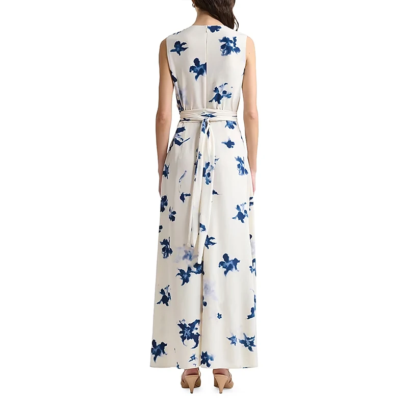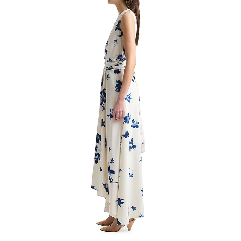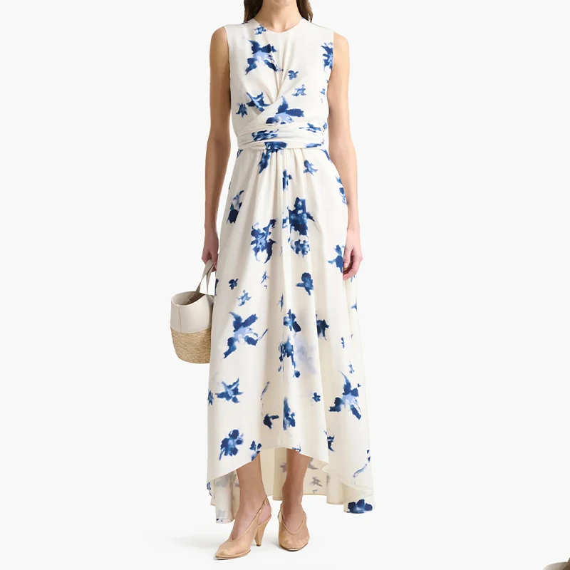ZYHT 73958 White Casual Dress Blue Flower Floral Printed Summer Asymmetric Hem Sleeveless Women Lady Girl Dress
