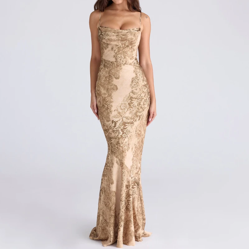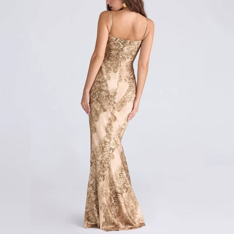 ZYHT 73957 Hot Selling Women Lady Printed Satin Beige Mermaid Fish Tail Floor Length Party Cocktail Evening Dress Gown