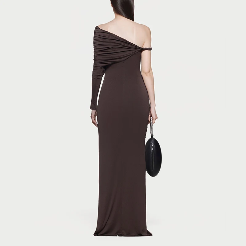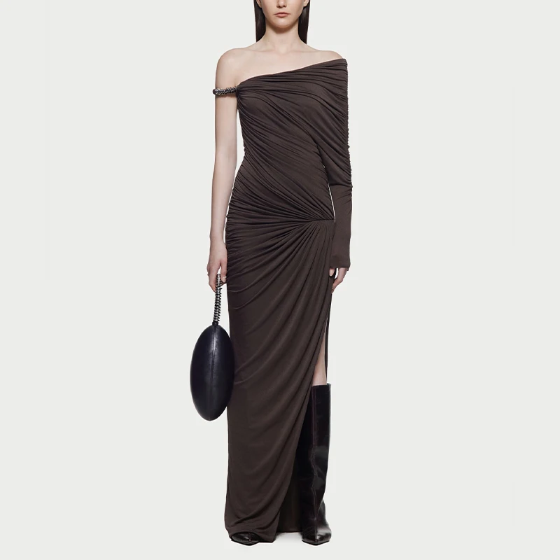 ZYHT 73849 European Wholesale Fashion Casual One Shoulder Ruched Maxi Dress Side Slit Pleated Long Sleeve Dresses for Women