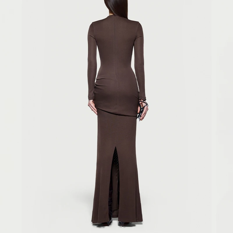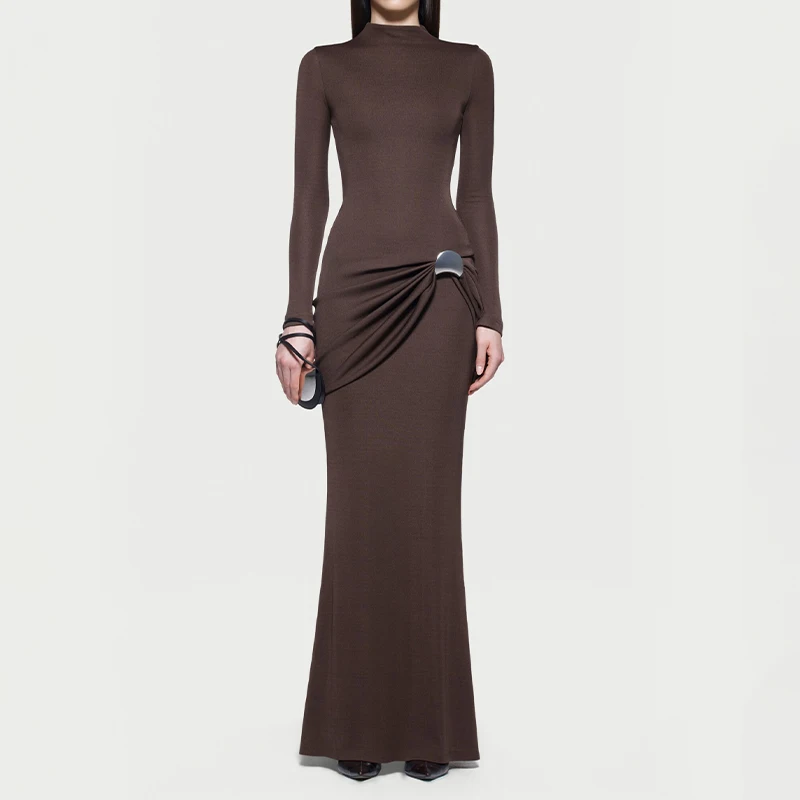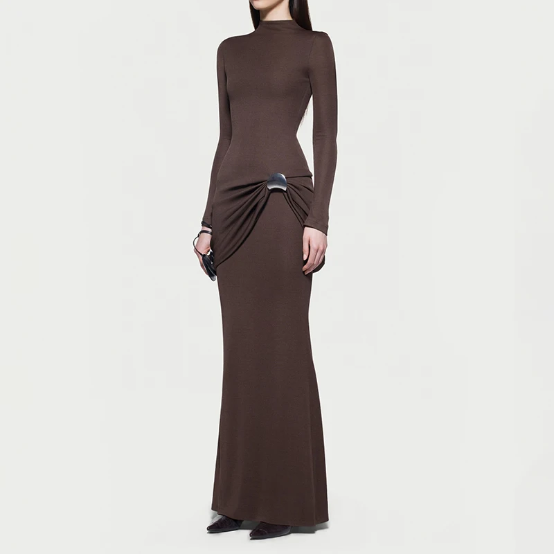 ZYHT 73907 Custom Design Long Sleeve High Neck Fashion Pleated Crystal Beads Ruched Knot High Slit Sexy Luxury Evening Dress