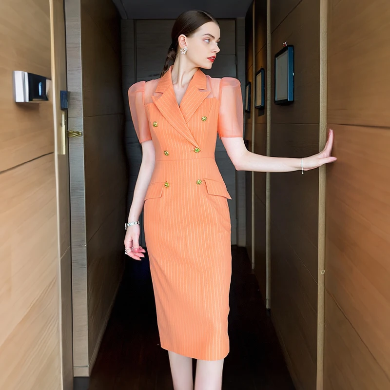 ZYHT 50927 Wholesale Formal Dresses Mesh Patchwork Summer Elegant Orange Professional Career Ladies Office Dresses for Women