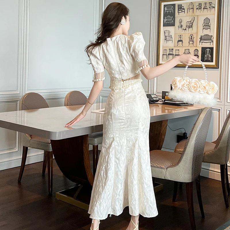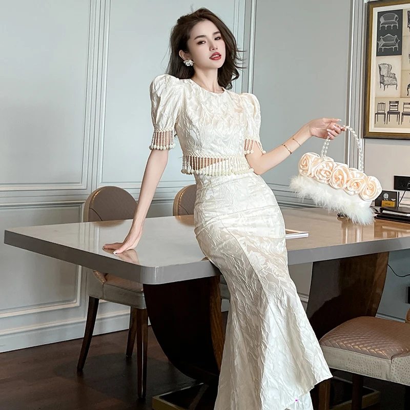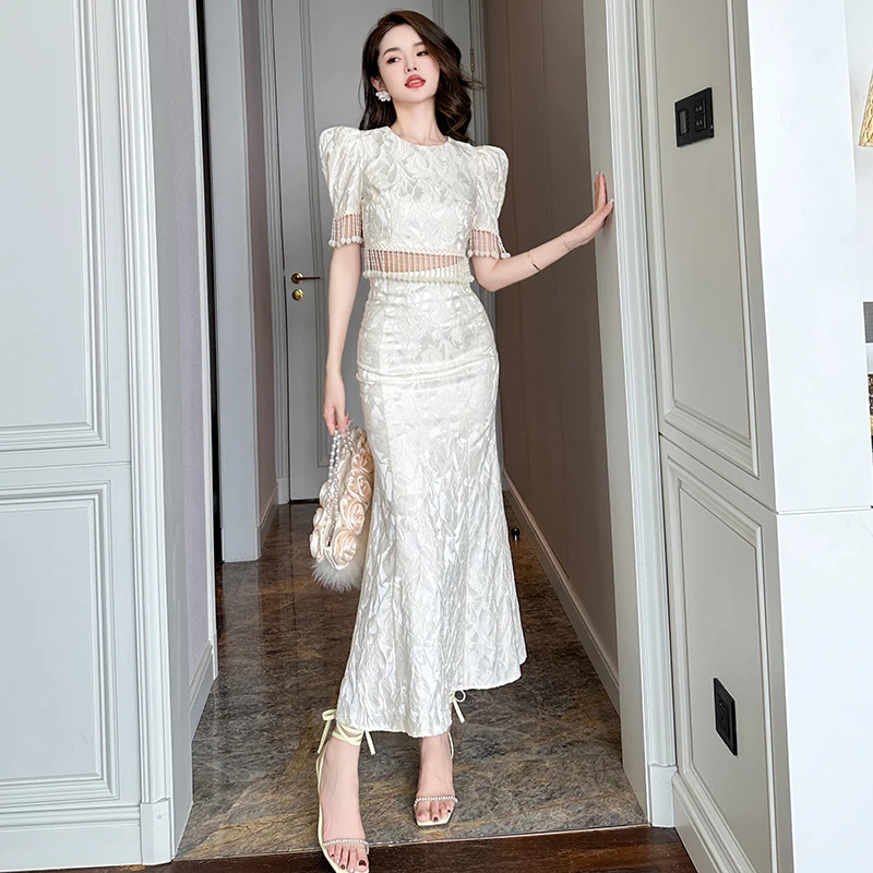 ZYHT 10521 Fashion Summer Sets for Ladies Satin Short Sleeve Tassel Crop Top Fishtail Long Skirt Two Pieces Set Women Clothing