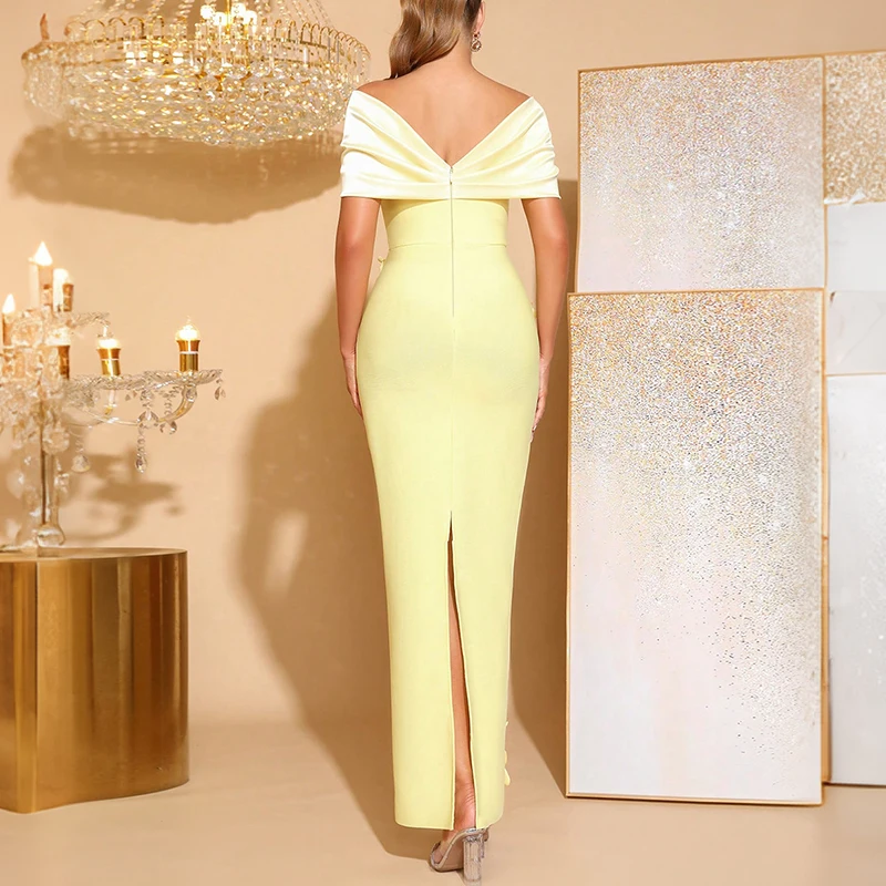ZYHT 70145 Formal Pencil Off Shoulder Vestidos Floral Applique Yellow Long Party Dresses for Women Evening Gown Dress Elegant
