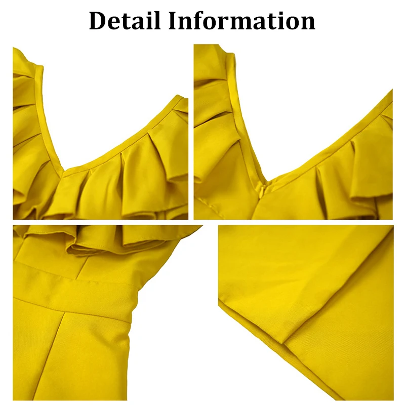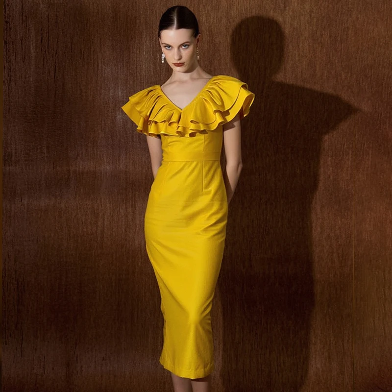 ZYHT 30502 Lotus Leaf Ruffle Flying Sleeve Sexy Party Casual Dresses V-neck Stretch Bright Yellow Dress for Women