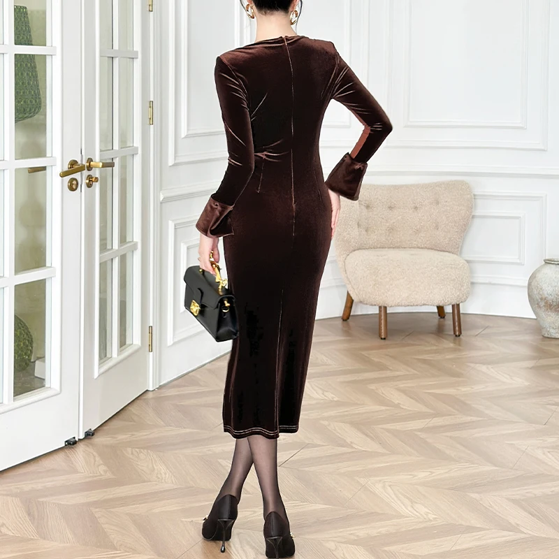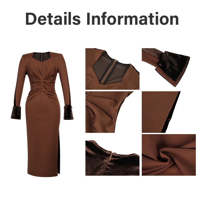 ZYHT 45351 Brown Bodycon Midi Dress with Long Sleeves Square Neck Dress Ruched Bodice Contrast Cuff Dresses for Women