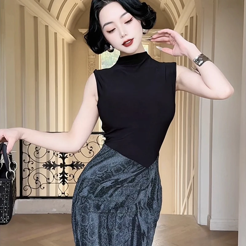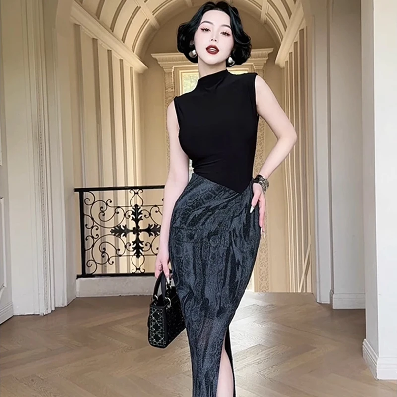 ZYHT 73933 Summer Collection Sexy Women Clothes Bodycon Knitted Sleeveless High Neck Printed Skirt Pencil Casual Daily Dress