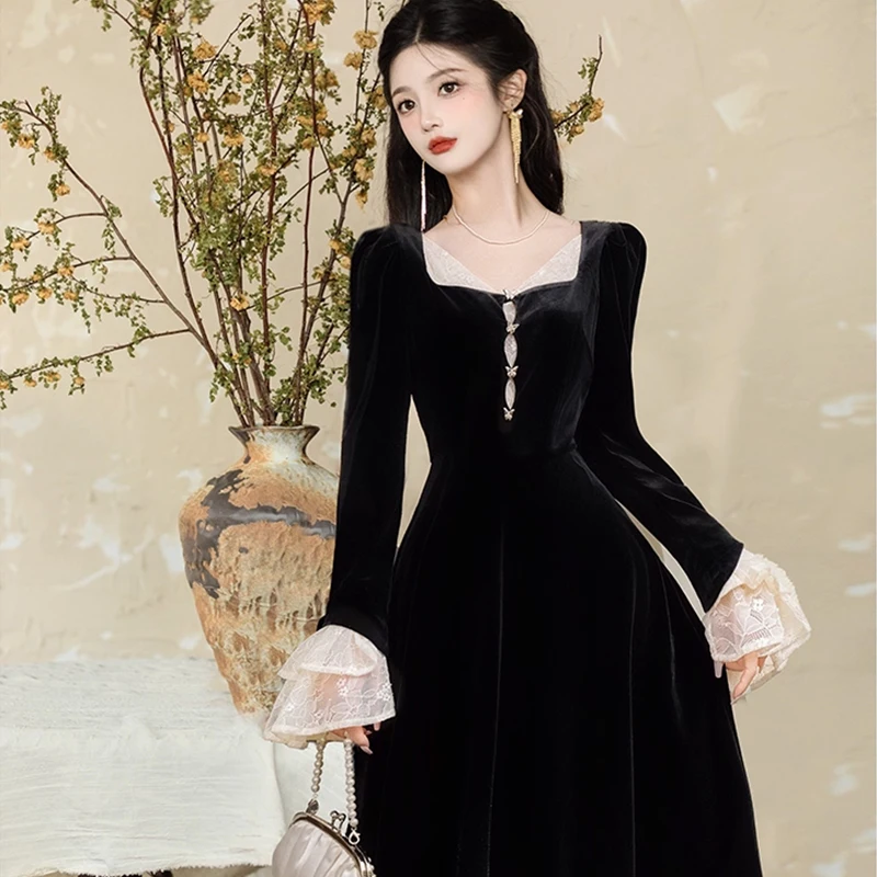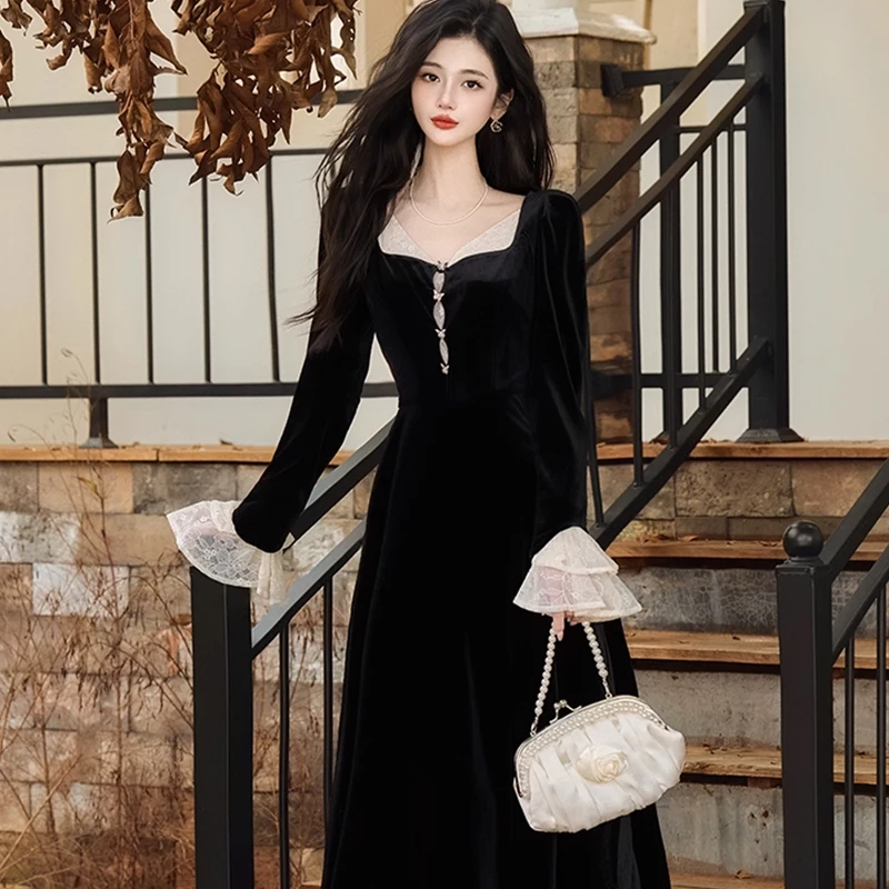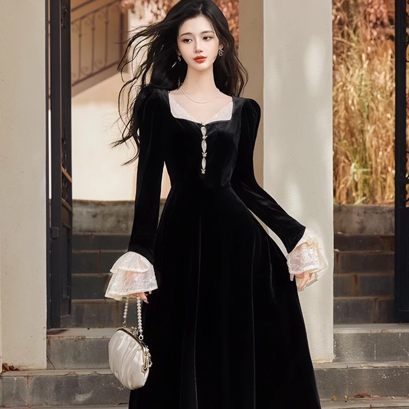 ZYHT 73931 Autumn Spring Black Soft Velvet Long Sleeve Lace Flared V Neck Button Maxi Formal Casual Dress