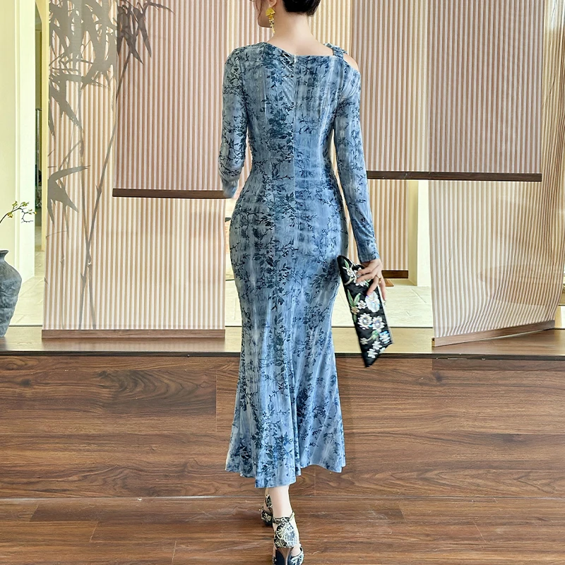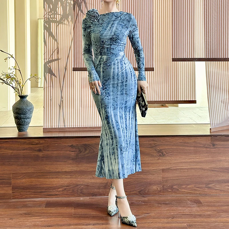 ZYHT 21894 Elegant Blue Jersey Midi Dress with Long Sleeves Dresses Shoulder Flower Bodycon Dress Women's Elegant Dress