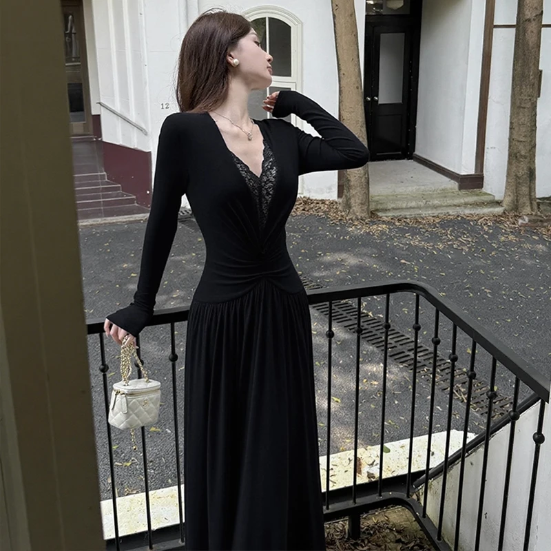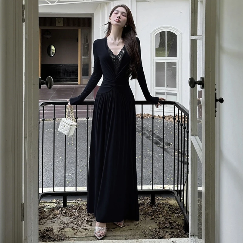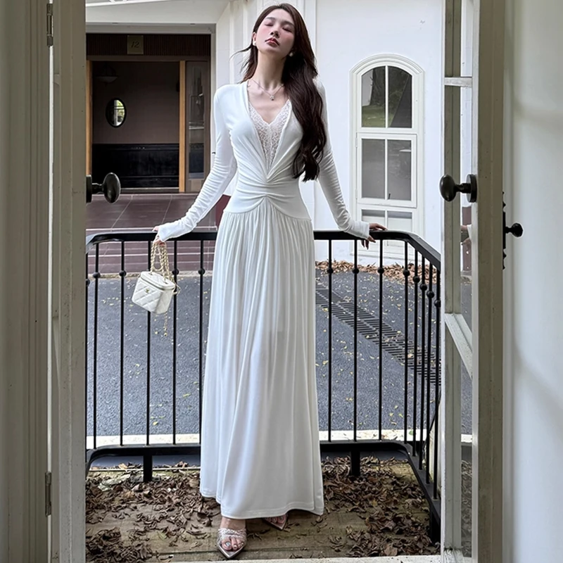 ZYHT 73927 Customization Clothes Factory Autumn Long Sleeve Soft Knitted Stretch White Black Lace Maxi Gown Casual Dress