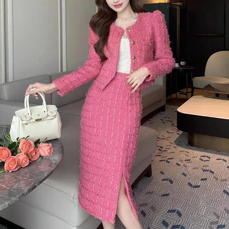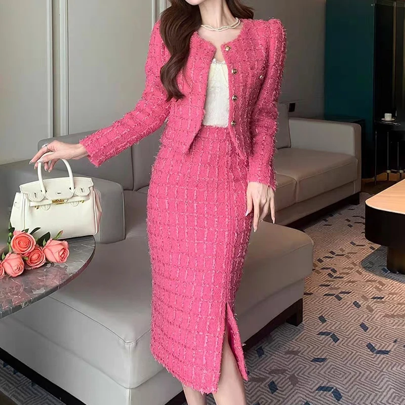 ZYHT 74070 Tweed Women Lady Two-Piece Suit Winter Spring Autumn Blazer Midi Skirt Plain Dyed Woven Worsted Casual for Spring