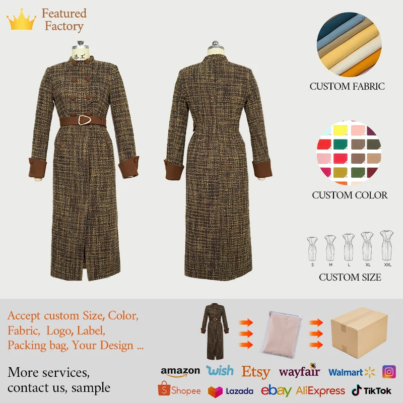 ZYHT 11490 Ready Ship Women Spring Elegant Double-Breasted Plain Tweed Fabric Pockets Coat Career Long Midi Dress for Ladies