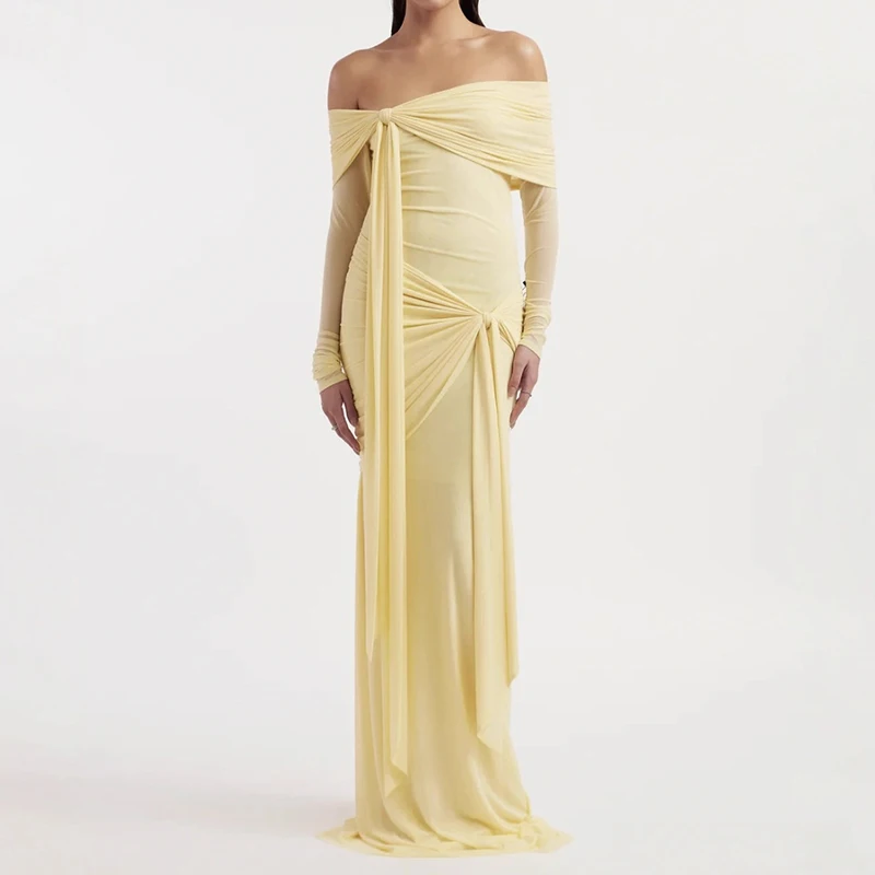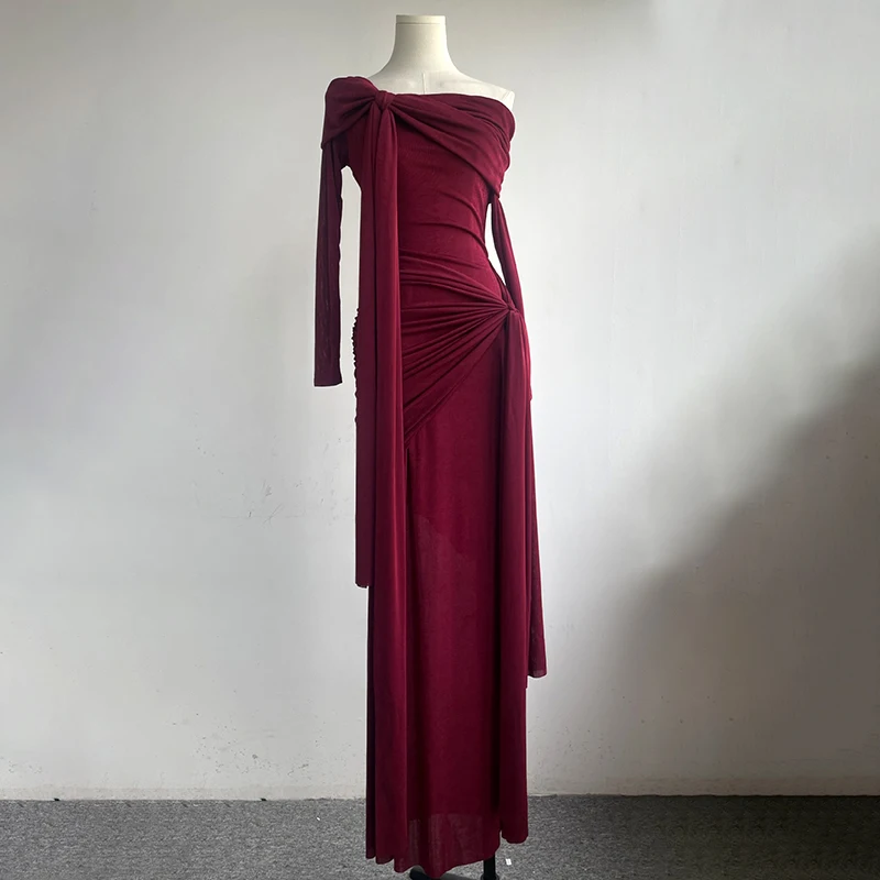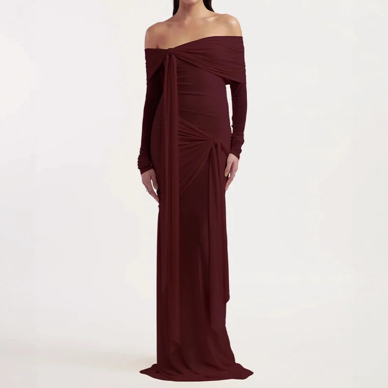 ZYHT 70124 Stretchy Fabric Ribbon Off Shoulder Knotted Long Sleeve Pleated Burgundy Elegant Maxi Evening Dresses for Women