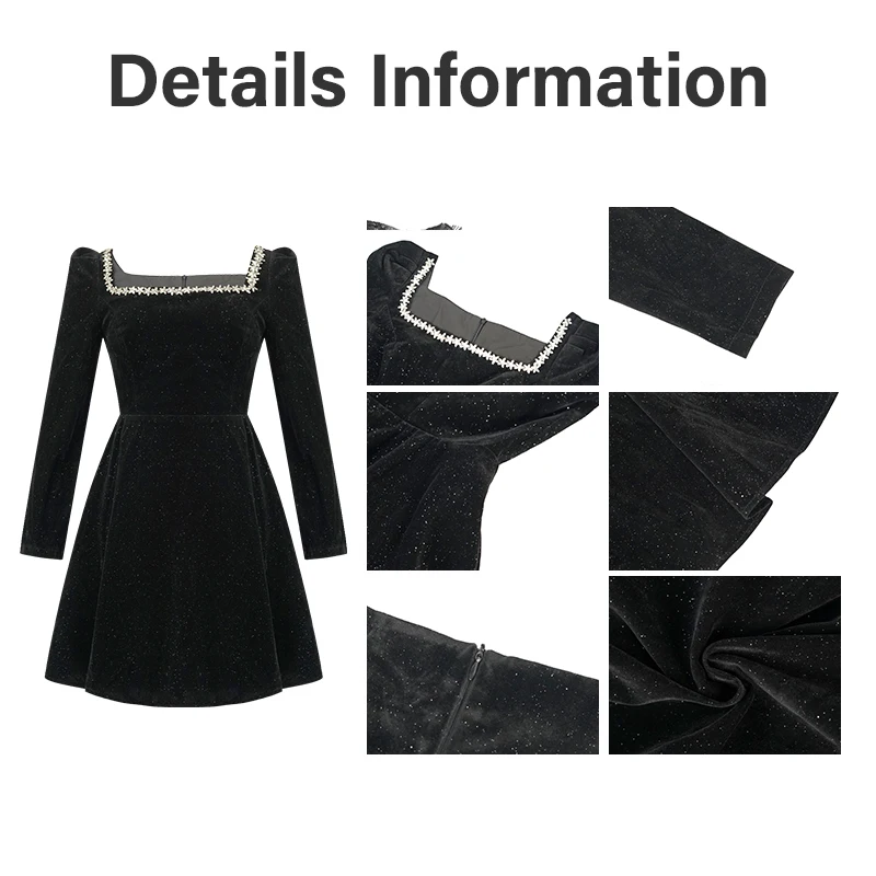 ZYHT 9970 Prom Dresses 2026 Black Glitter Velvet Mini Dress with Pearl-Trimmed Square Neck & Long Puff Sleeves Dresses