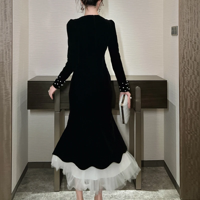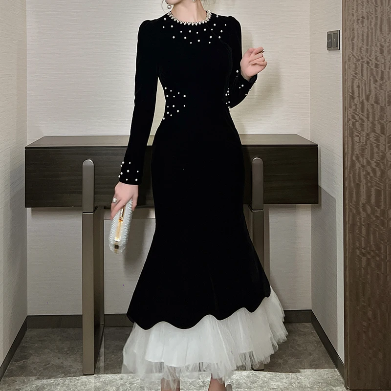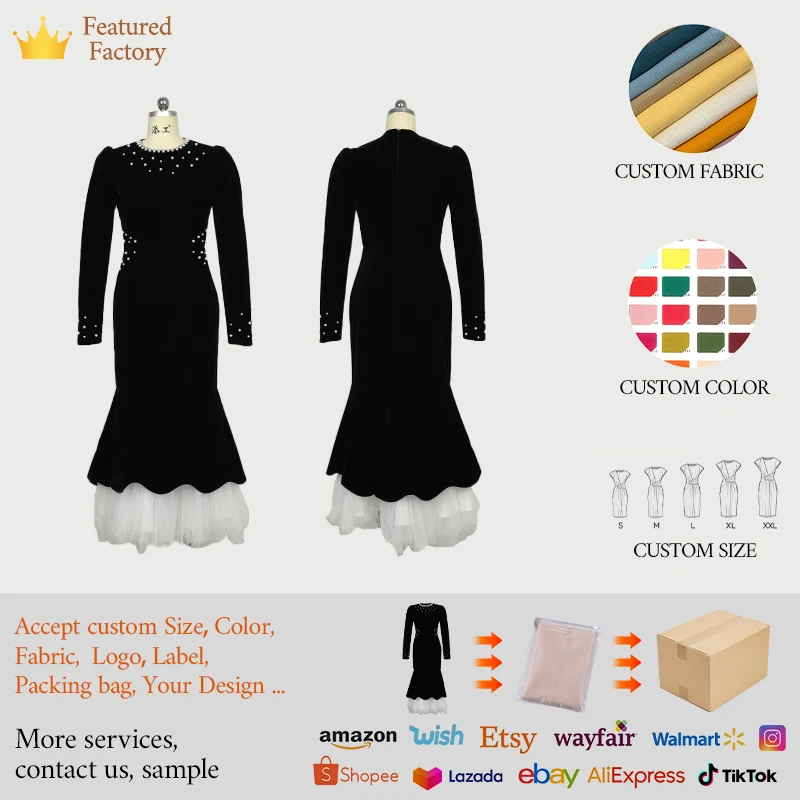 ZYHT 21630 Women Modest Luxury Mermaid Velvet Dress Corset Pearl Embellished Lace Maxi Formal Party Prom Black Evening Dresses