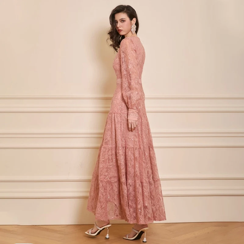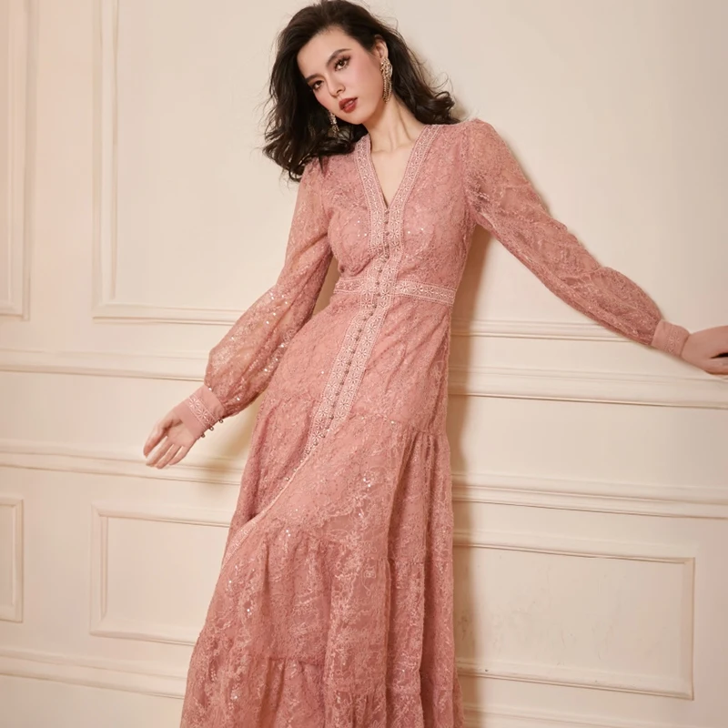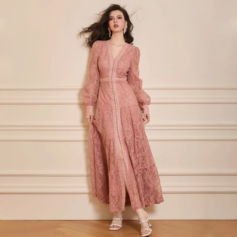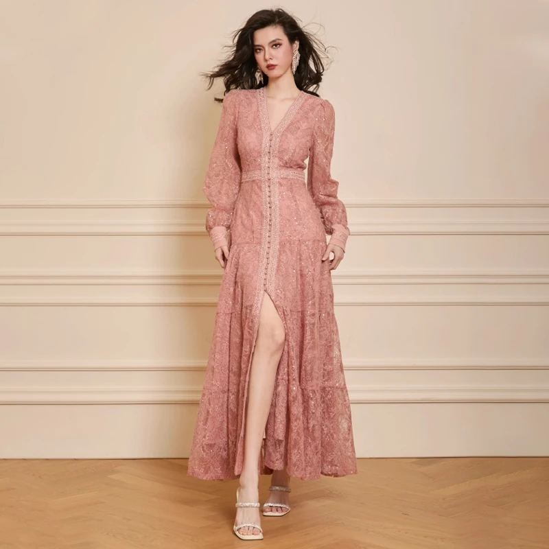 ZYHT 73924 OEM ODM Customize Factory Sequin Pink Lace Ruffle Long Sleeve V Neck High Slit a Line Maxi Dress