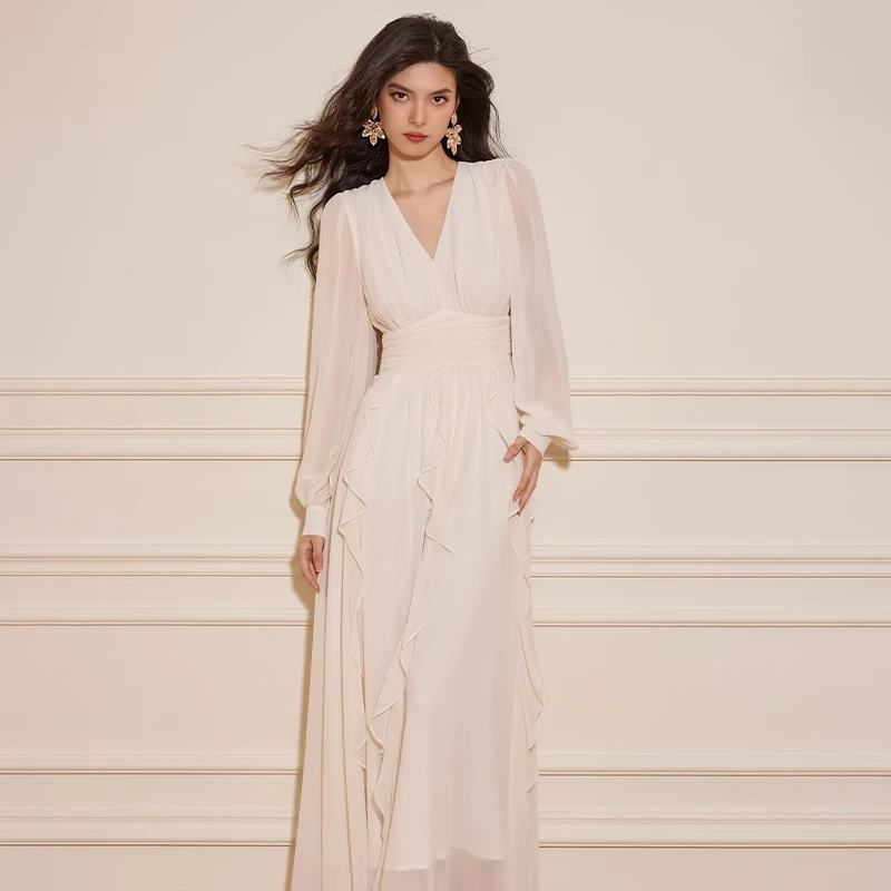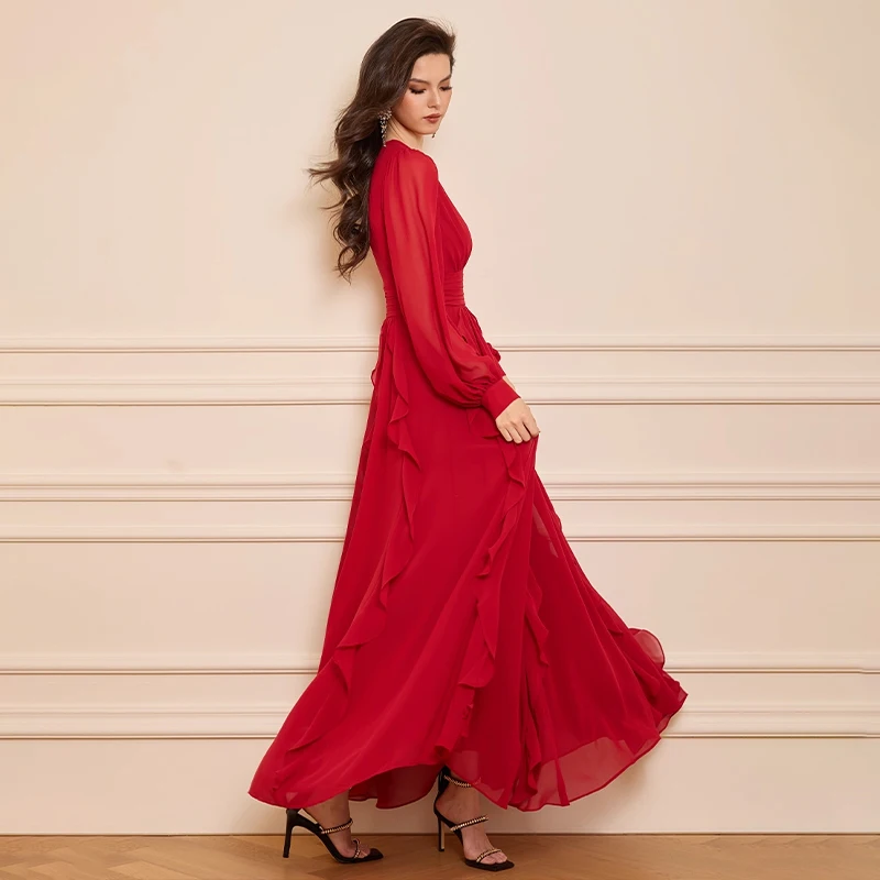 ZYHT 73918 Lady Mon Girlfriend Christmas Gift Ruffle Long Sleeve Red Chiffon Ruffle V Neck Ruffle Maxi Dress