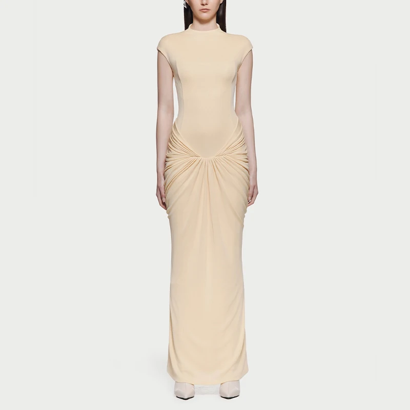 ZYHT 73907 Custom Design Long Sleeve High Neck Fashion Pleated Crystal Beads Ruched Knot High Slit Sexy Luxury Evening Dress