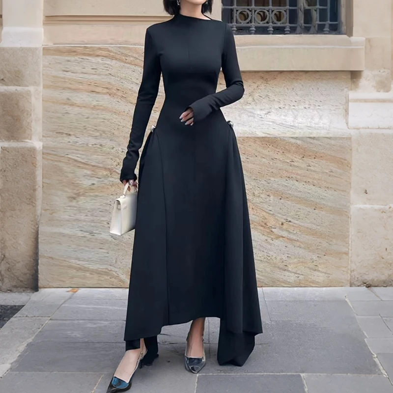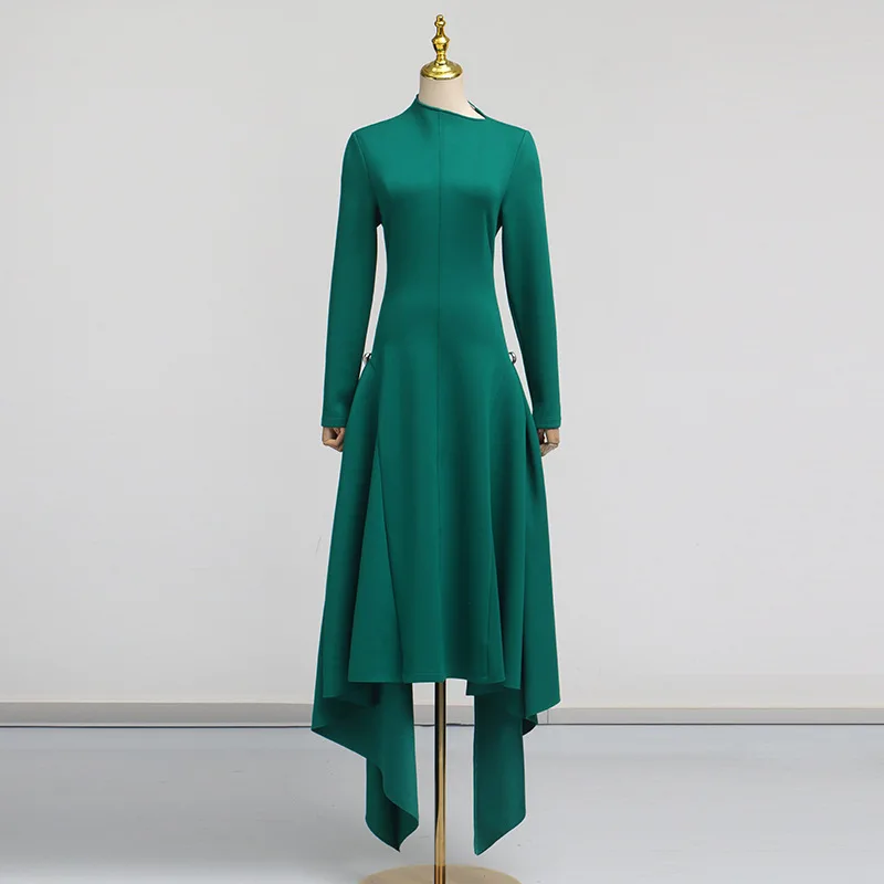 ZYHT 70123 Boutique Clothing Long Sleeve Women Slant Collar Irregular Green Long Dresses Fashion Party A-Line Dress for Women