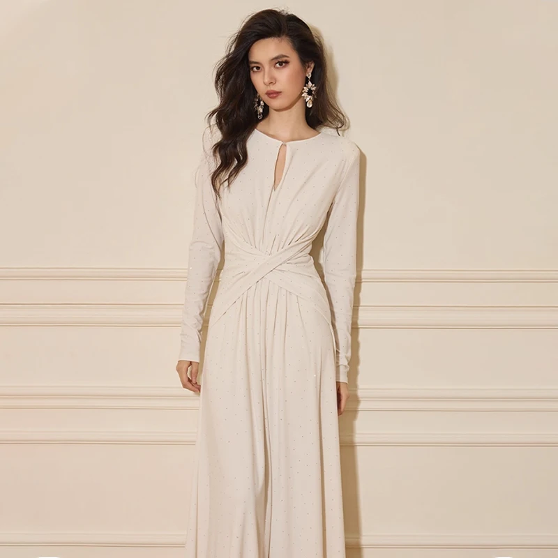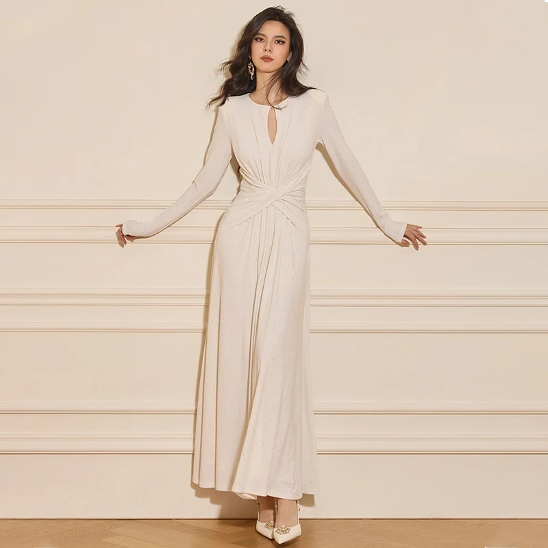 ZYHT 73916 Autumn New Cloud Cedar Dress Cross Design White Elegant Maxi V Neck Long Sleeve Knitted Casual Dress