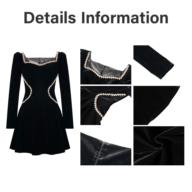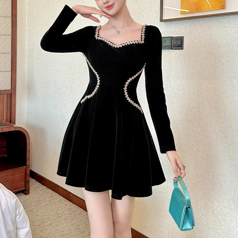 ZYHT 21939 Black Velvet Mini Dress with Rhinestone-Trimmed Square Neck & Long Sleeves Sparkle Detail Women's Dresses