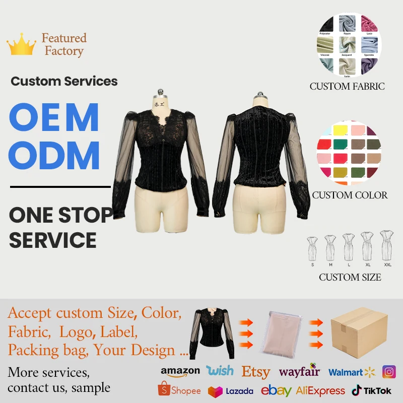 ZYHT 21907 Black Lace & Velvet Corset Top with Sheer Organza Puff Sleeves V-Neck & Button Long Sleeve Dressy Blouse Women Blouse