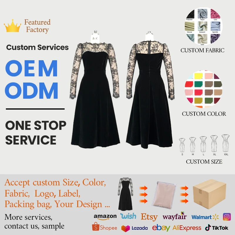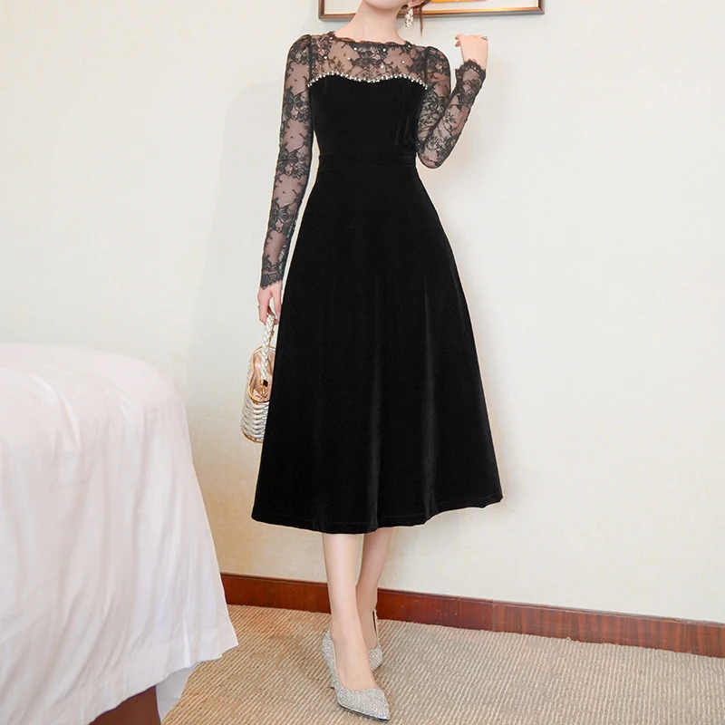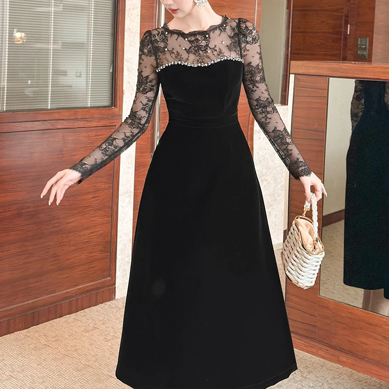 ZYHT 21881 Dresses Women Lady Elegant Black Velvet Midi Dress with Lace Illusion Neckline Long Sleeves Rhinestone
