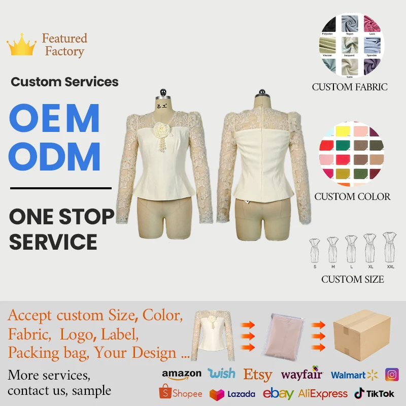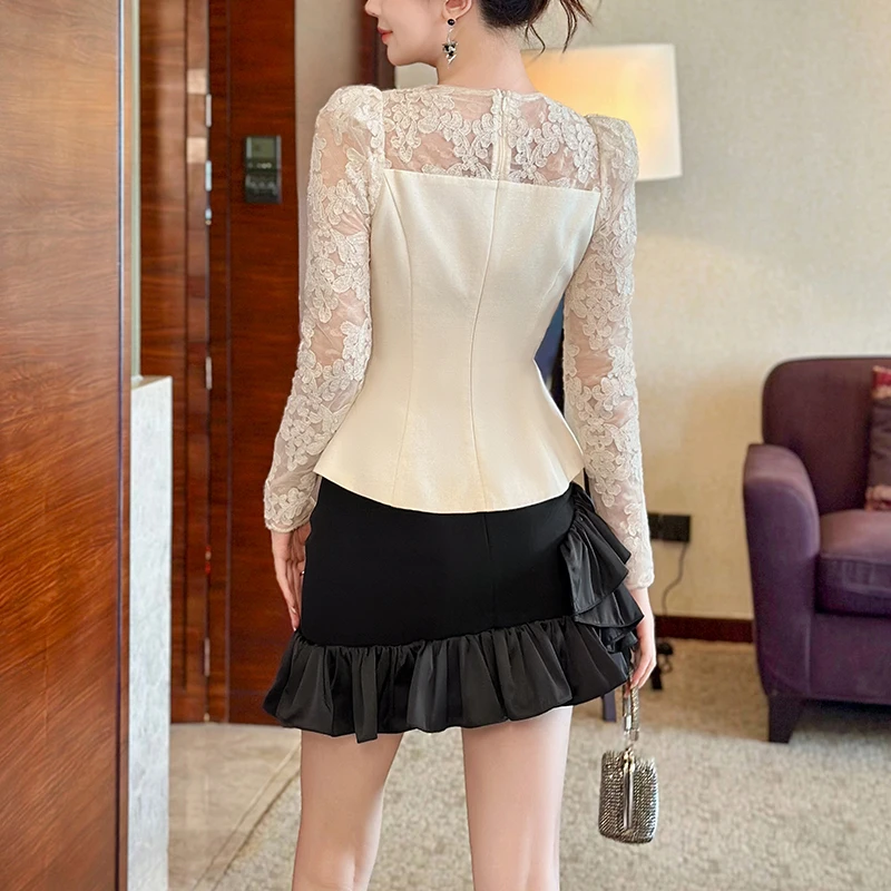 ZYHT 82055 Casual Summer Women's Black Peplum Top Blouse Contrast White Lace Scalloped Hem Puff Sleeves Fabric Floral Pattern
