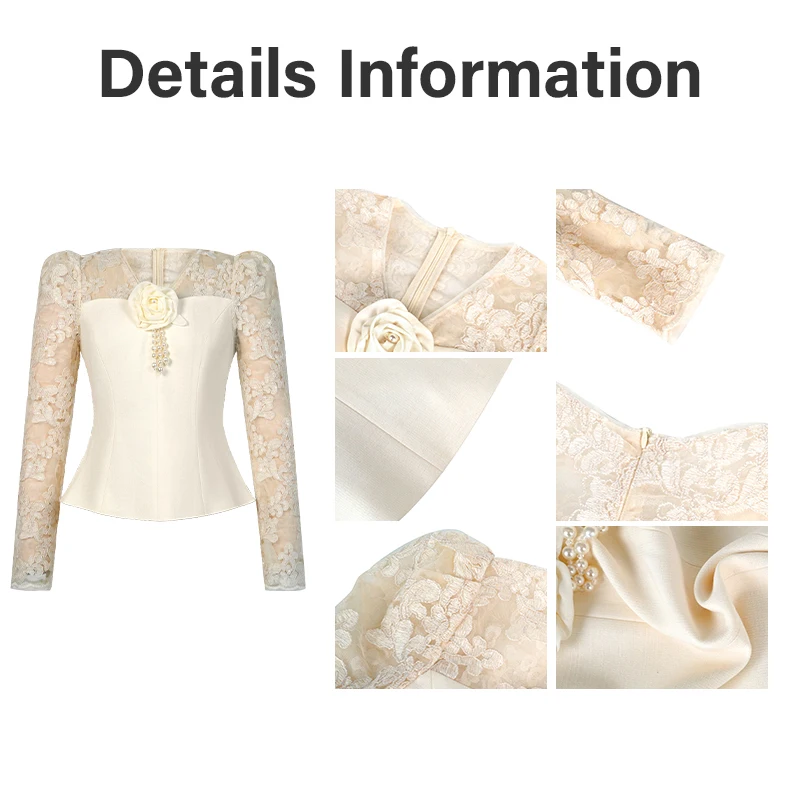 ZYHT 15536 Long Sleeve Blouses Apricot Lace Sleeve Blouse with Floral Accent & Peplum Fit Long Sleeve V-Neck Top