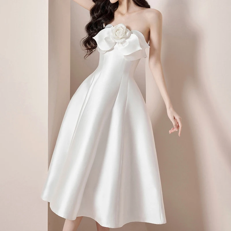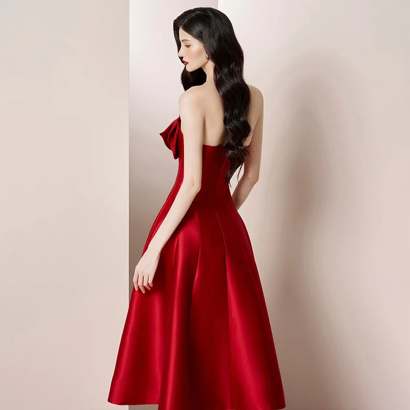 ZYHT 70116 Elegant Evening Strapless a Line Prom Dress Clothing Manufacturer 3D Flower Midi Red Ladies Satin Party Wear Dresses
