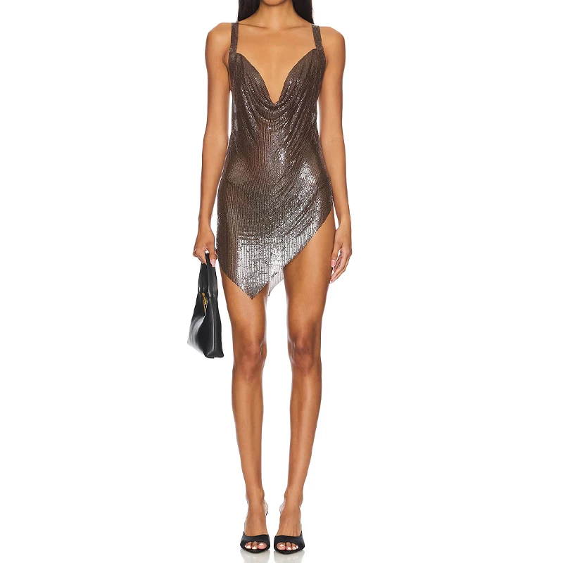 ZYHT 73625 Women's Summer Party Dresses New Sexy Backless Sequined Club Wear with High Slit Deep V Bling Natural Waistline