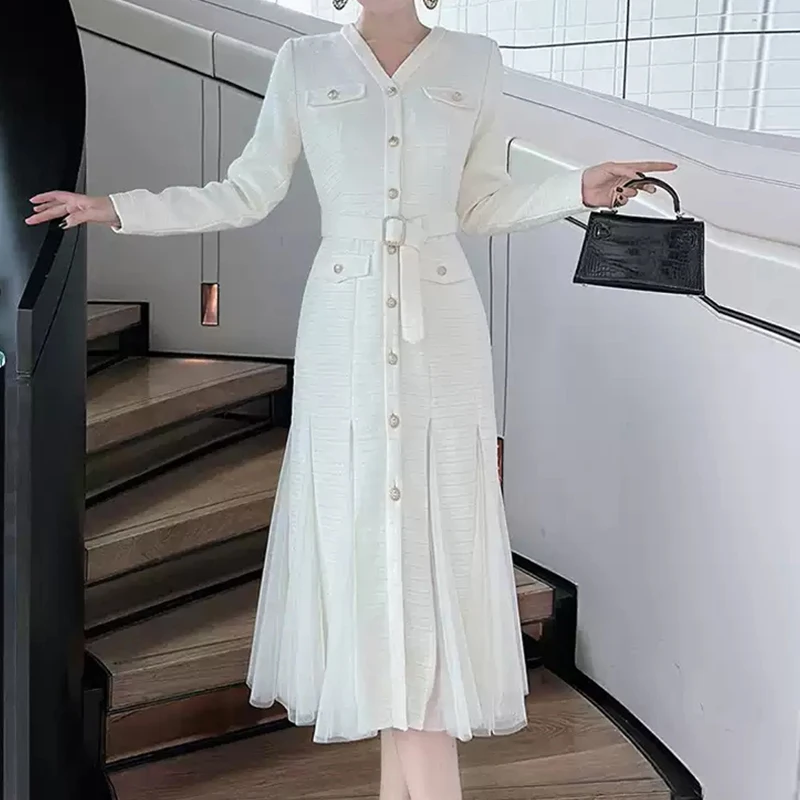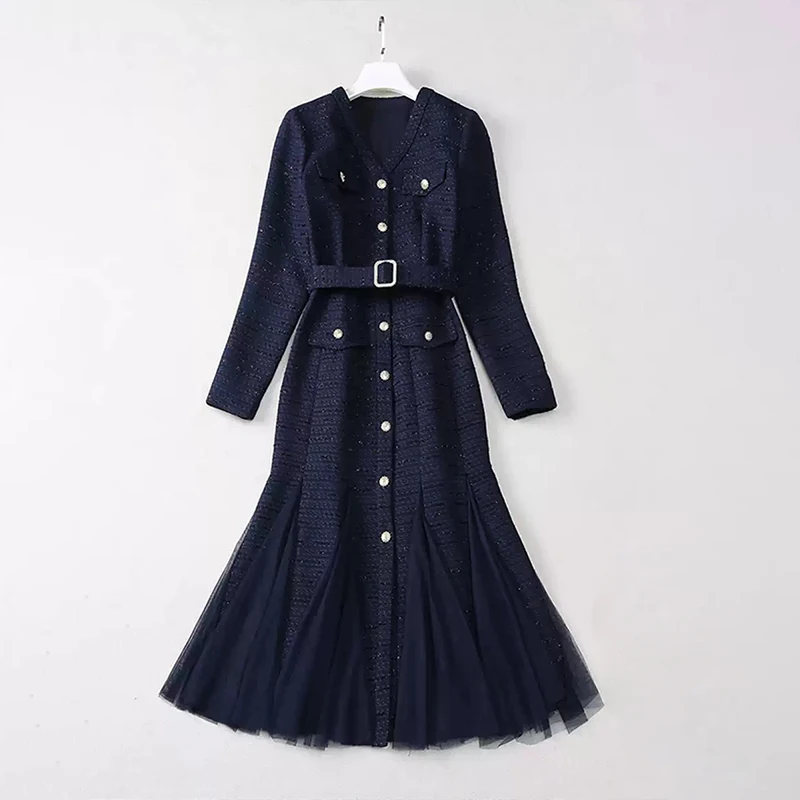 ZYHT 74081 Women Elegant Office Autumn Winter Chic V-neck Dress White and Dark Blue Tweed Mesh Mermaid Design