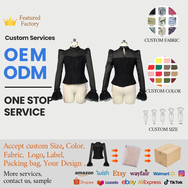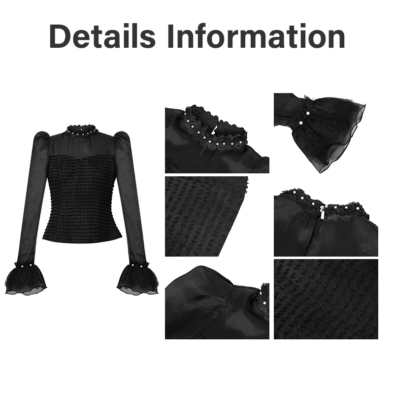 ZYHT 11690 Women Blouse Black Sheer Mesh Blouse with Pearl-Trimmed Mock Neck & Puff Sleeves Textured Bodice & Flared Cuffs