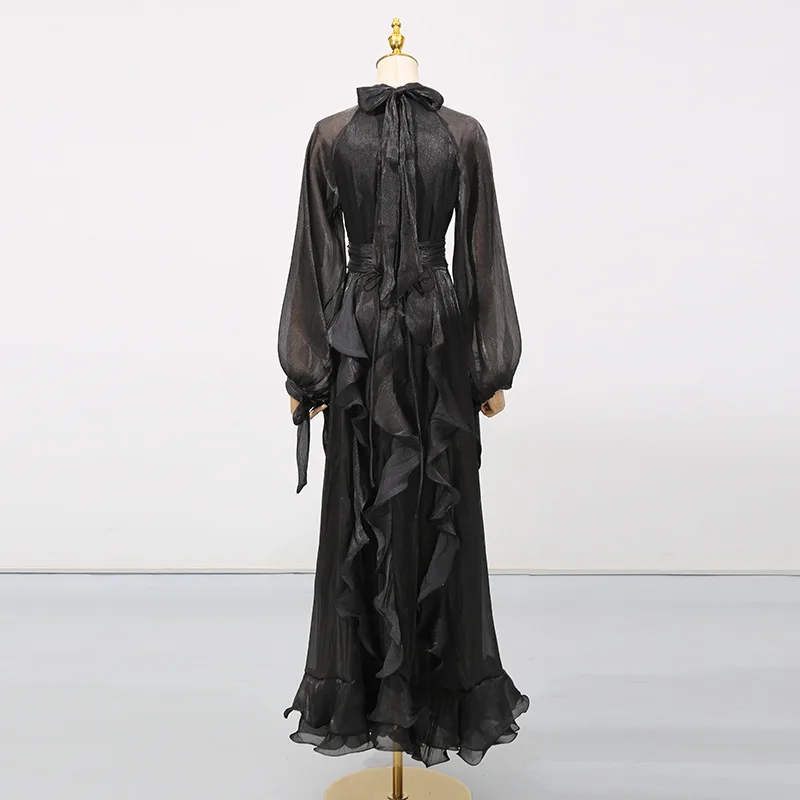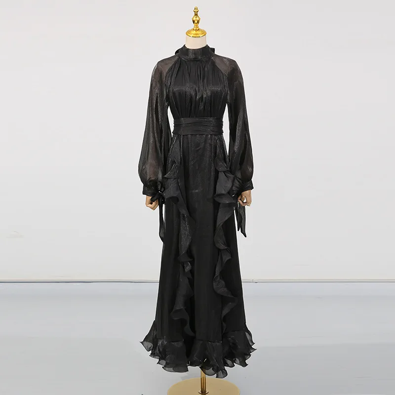 ZYHT 70108 New Autumn Winter French Fashion Organza Fairy Folds Ruffle Lantern Long Sleeve Flowy Elegant Maxi Dress for Women