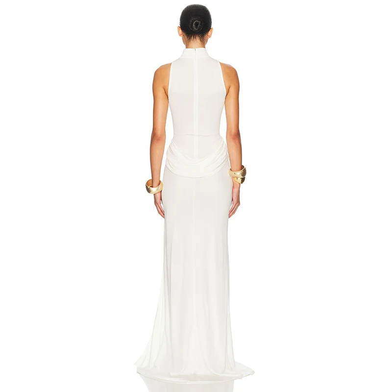 ZYHT 70081 Elegant Sexy Formal Women Clothes Jersey Pleated High Slit High Neck Knitted Evening Party Club Dresses