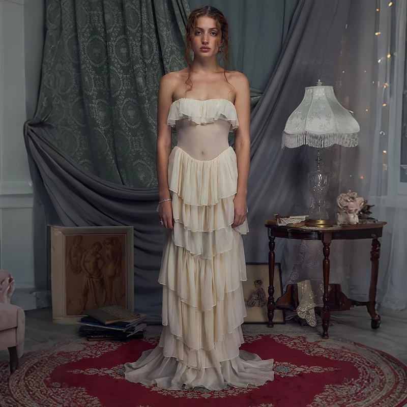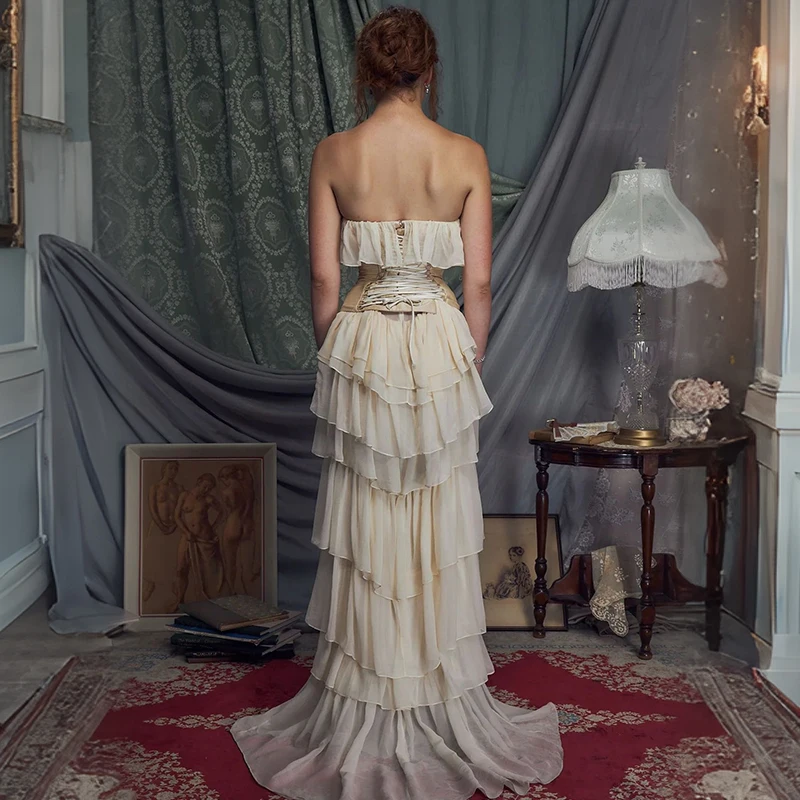 ZYHT 70080 Wholesale Manufacturer Strapless Strap Chiffon Long Layers Cake Maxi Corset Boning White Dress