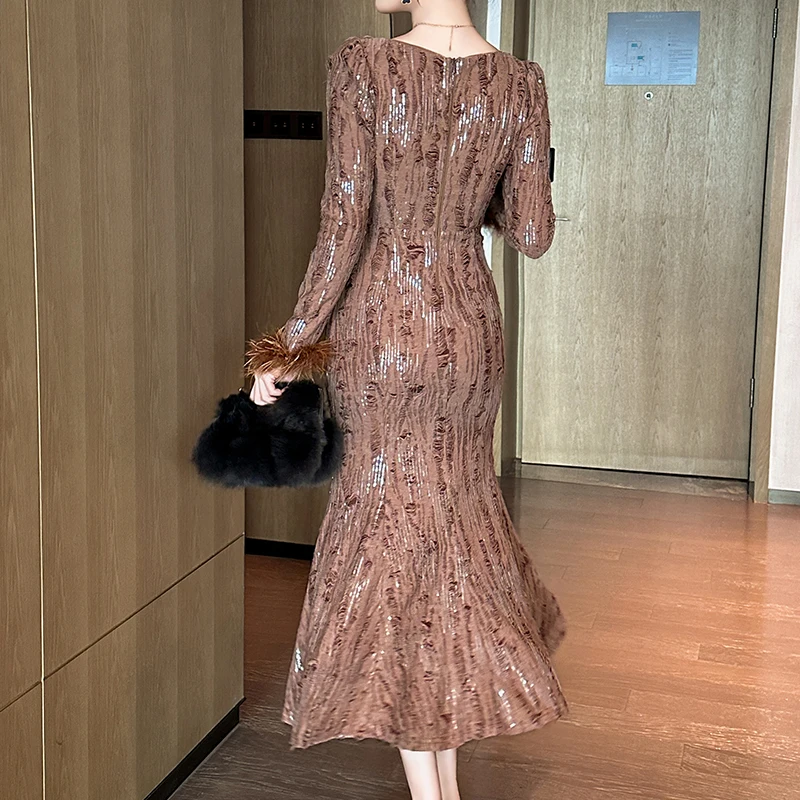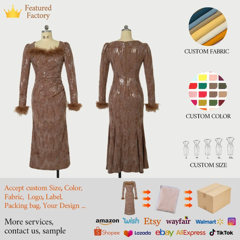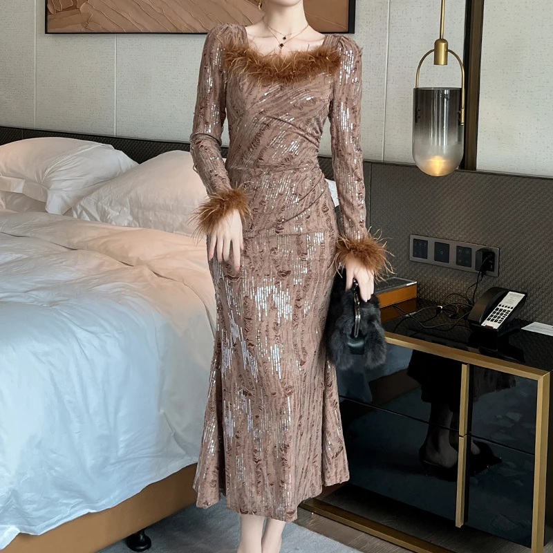 ZYHT 80345 Spring Long Sleeve Luxury Formal Dress Wholesale Feather Sequined Long Party Dinner Evening Dress Women
