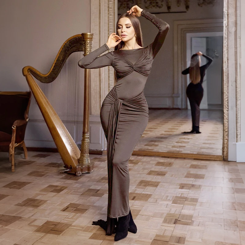 ZYHT 73907 Custom Design Long Sleeve High Neck Fashion Pleated Crystal Beads Ruched Knot High Slit Sexy Luxury Evening Dress