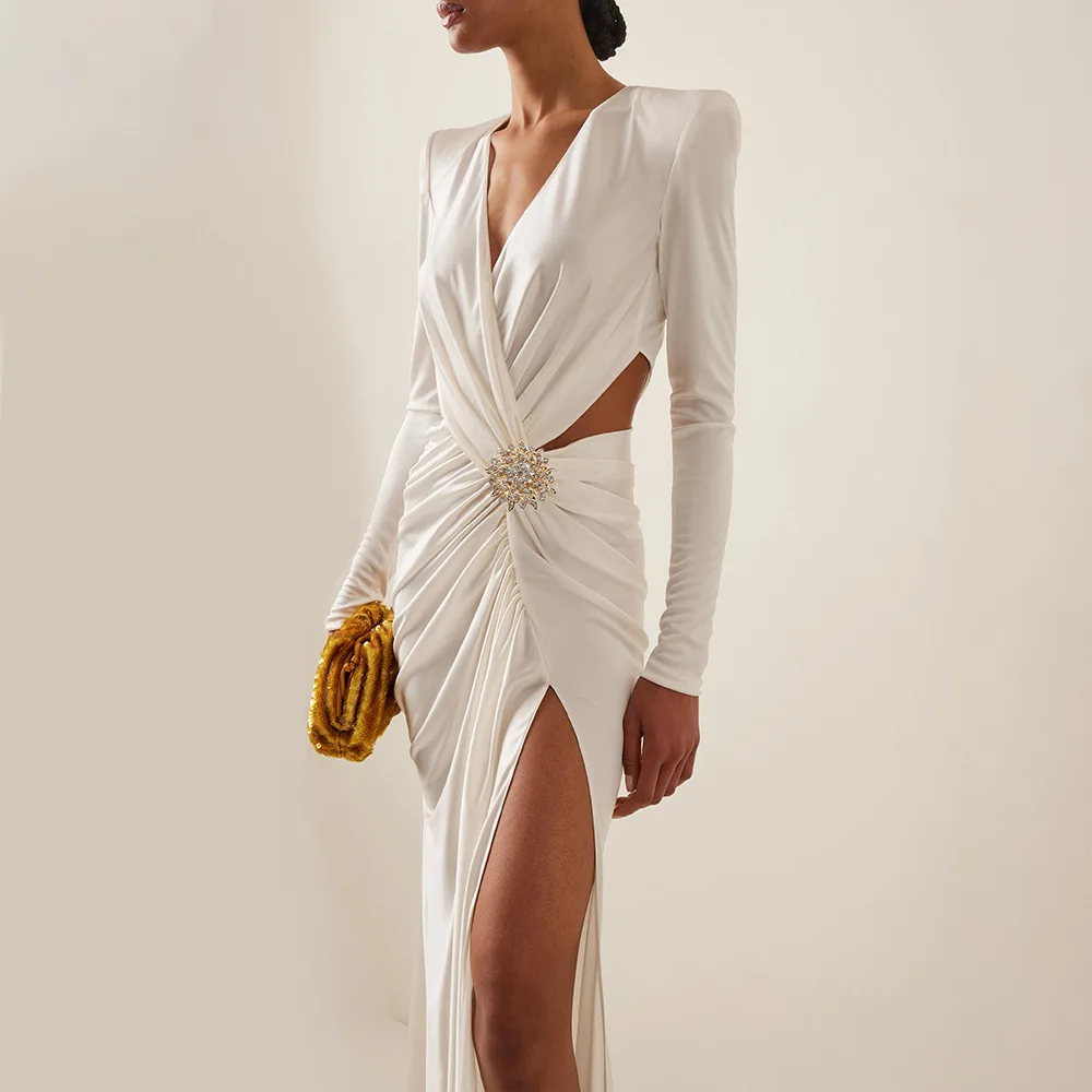 ZYHT 73907 Custom Design Long Sleeve High Neck Fashion Pleated Crystal Beads Ruched Knot High Slit Sexy Luxury Evening Dress