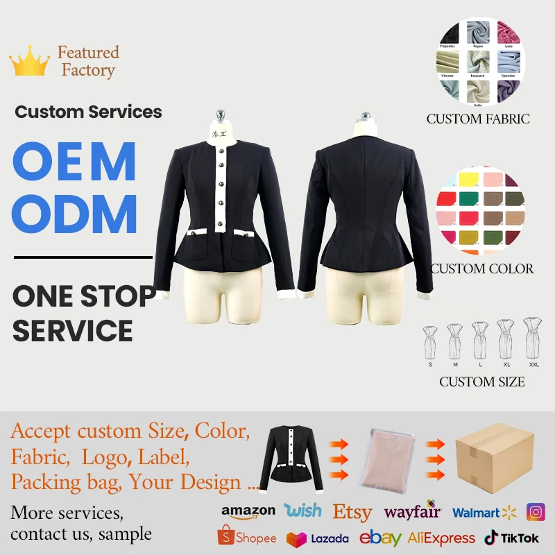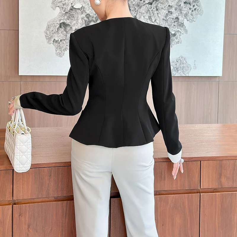 ZYHT 35240 Women's Casual blazer Black & White Contrast Peplum Blazer with Round Neck Slim Fit Vintage Jacket for Office
